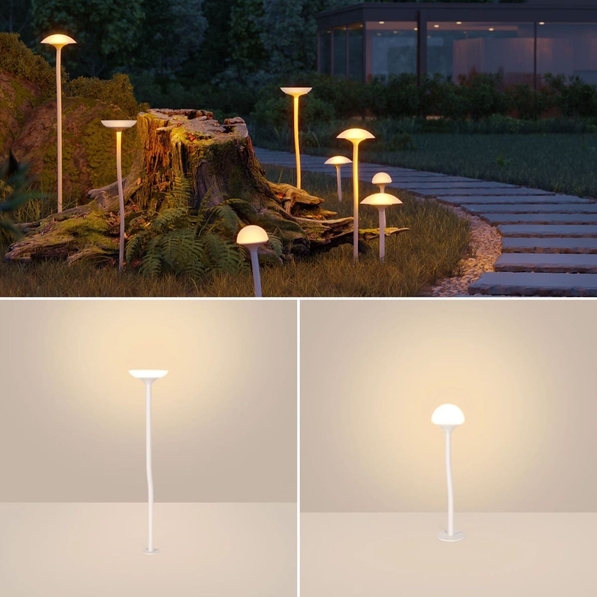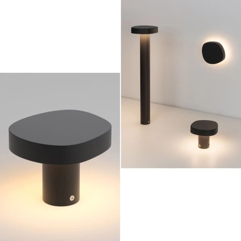 Что важно знать: IP65, теплый свет 3000K, широкий угол 92°. Есть три высоты: 100 мм (почти скрыт в траве), 500 мм (подходит для большинства дорожек) и 700 мм (хорошо виден на уровне кустов). Плюс настенная версия высотой всего 49 мм — крошечная «таблетка», которая мягко подсвечивает стену.