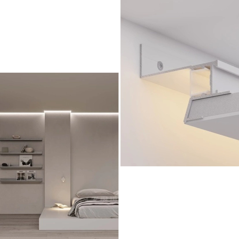 - Как это делается: используются специальные профили серии SHADOW, которые формируют ровный зазор и направляют луч точно на вертикальную поверхность. Для яркого и чистого светового контура необходима все та же высокоэффективная лента.