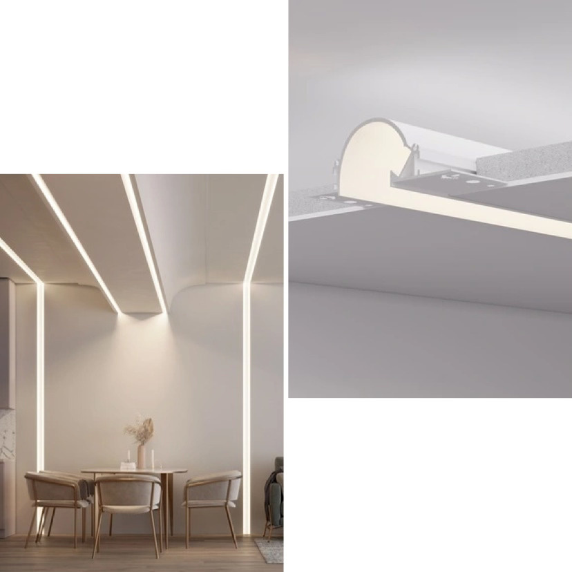 - Как это делается: используются встраиваемые профили с фланцем, которые «прячутся» под слоем шпаклевки (например, ARH-CEIL-REFLECT-2000). Это решение для тех, кто хочет добиться эффекта «магии» — когда свет есть, а его источника не видно.