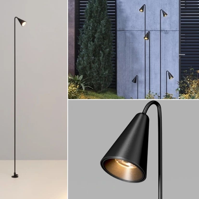 Что важно знать: IP65, теплый свет 3000K, широкий угол 92°. Есть три высоты: 100 мм (почти скрыт в траве), 500 мм (подходит для большинства дорожек) и 700 мм (хорошо виден на уровне кустов). Плюс настенная версия высотой всего 49 мм — крошечная «таблетка», которая мягко подсвечивает стену.