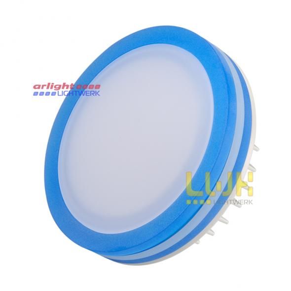 Круглый светильник с контурным свечением. Корпус белый с васильково-синим + вставка поликарбонат PC. Цвет БЕЛЫЙ ДНЕВНОЙ 4000К, св.поток 800 лм, угол 120°+180°. Питание 110-240VAC, 10Вт, 300mA 30-37V, драйвер в комплекте. Размеры 95х40 мм, установка в отв.80 мм, высота мин.40 мм.
