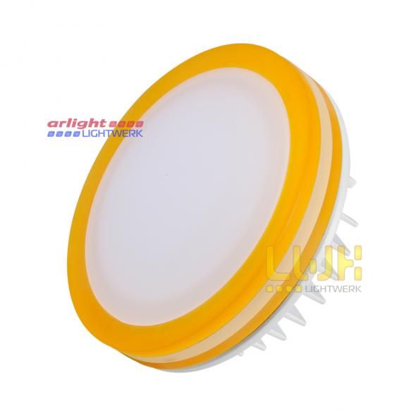 Круглый светильник с контурным свечением. Корпус белый с апельсиново-желтым + вставка поликарбонат PC. Цвет БЕЛЫЙ ДНЕВНОЙ 4000К, св.поток 800 лм, угол 120°+180°. Питание 110-240VAC, 10Вт, 300mA 30-37V, драйвер в комплекте. Размеры 95х40 мм, установка в отв.80 мм, высота мин.40 мм.
