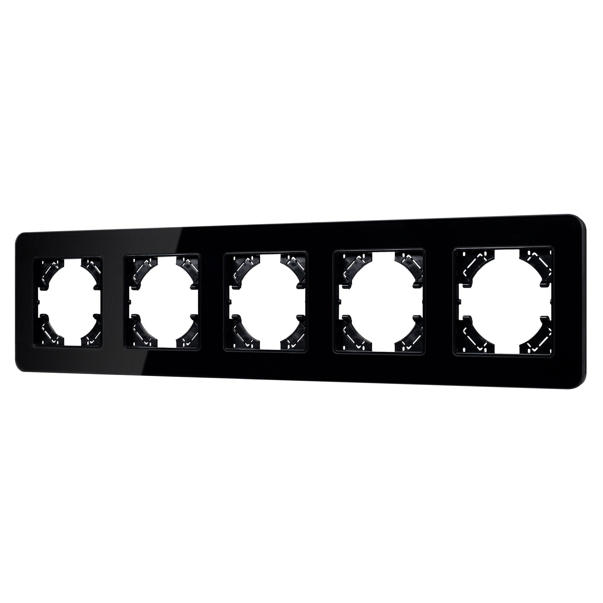 Рамка стеклянная на 5 постов, под встраиваемый механизм. Цвет - черный. Среднего уровня герметичности IP20. Ориентация монтажа - горизонтальная (основным ориентиром служат посадочные выступы для накладки механизма).