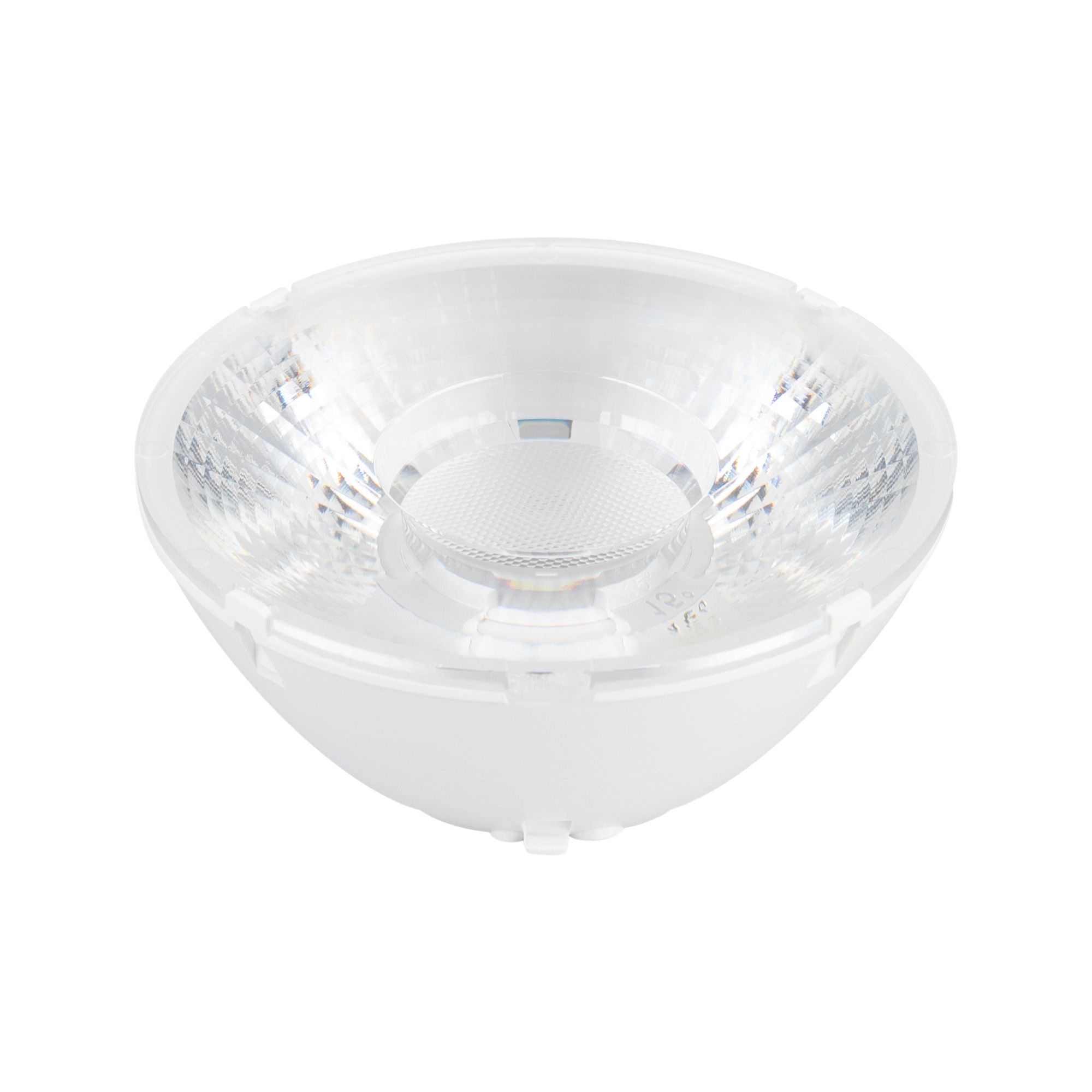 Одиночная линза c холдером белого цвета для светодиодов COB: 1919. Угол обзора: вертикальный 15°, прозрачная. Материал PC. Диаметр 75 мм, высота 22.7 мм.