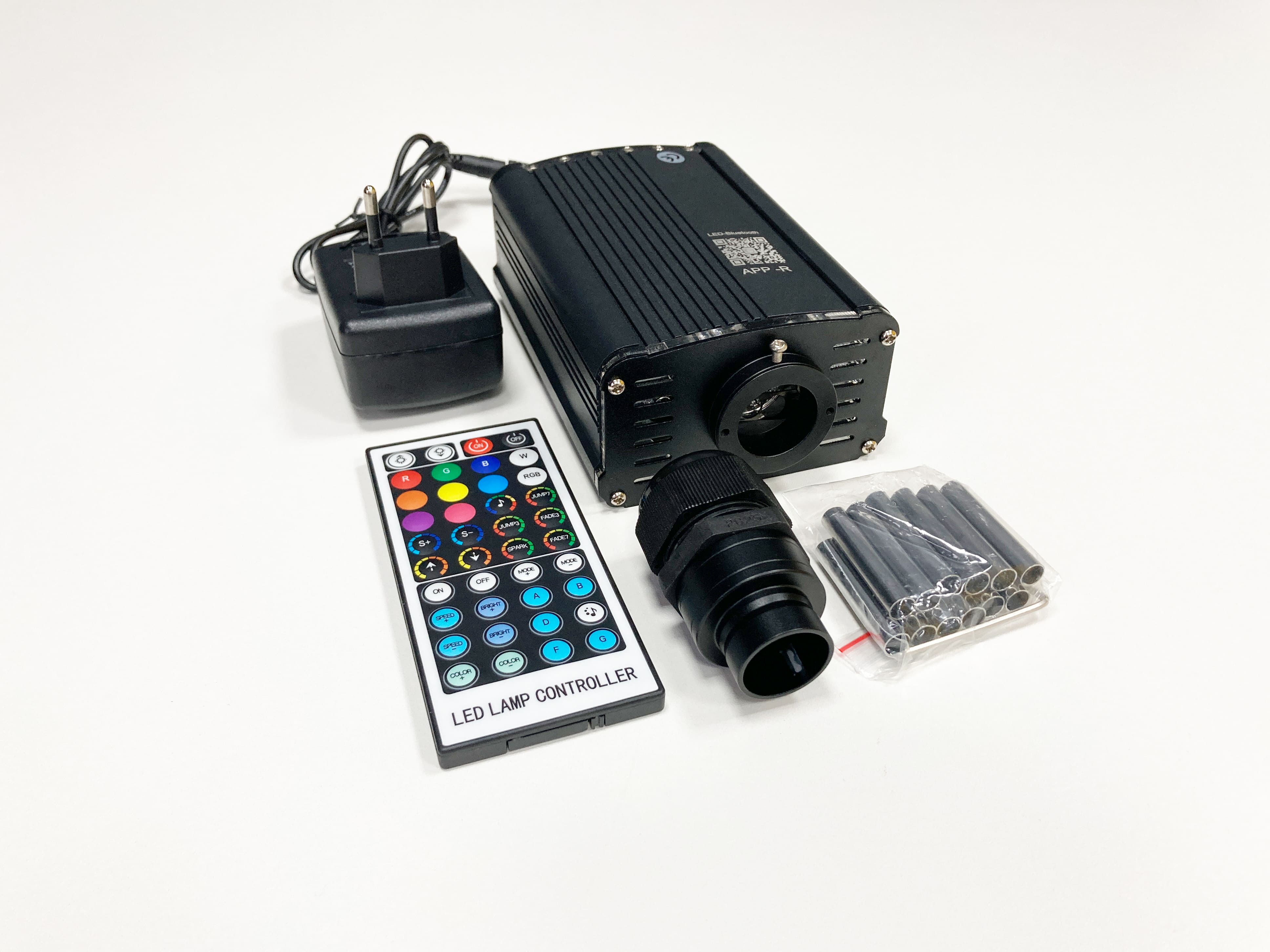 Источник света мощностью 18W оснащён 12 коннекторами (⌀5 мм) и одной муфтой (⌀20 мм). Управляется через RF-пульт и Bluetooth-приложение LED LAMP. Встроенное механическое колесо создаёт эффект мерцания, добавляя динамику освещению.
