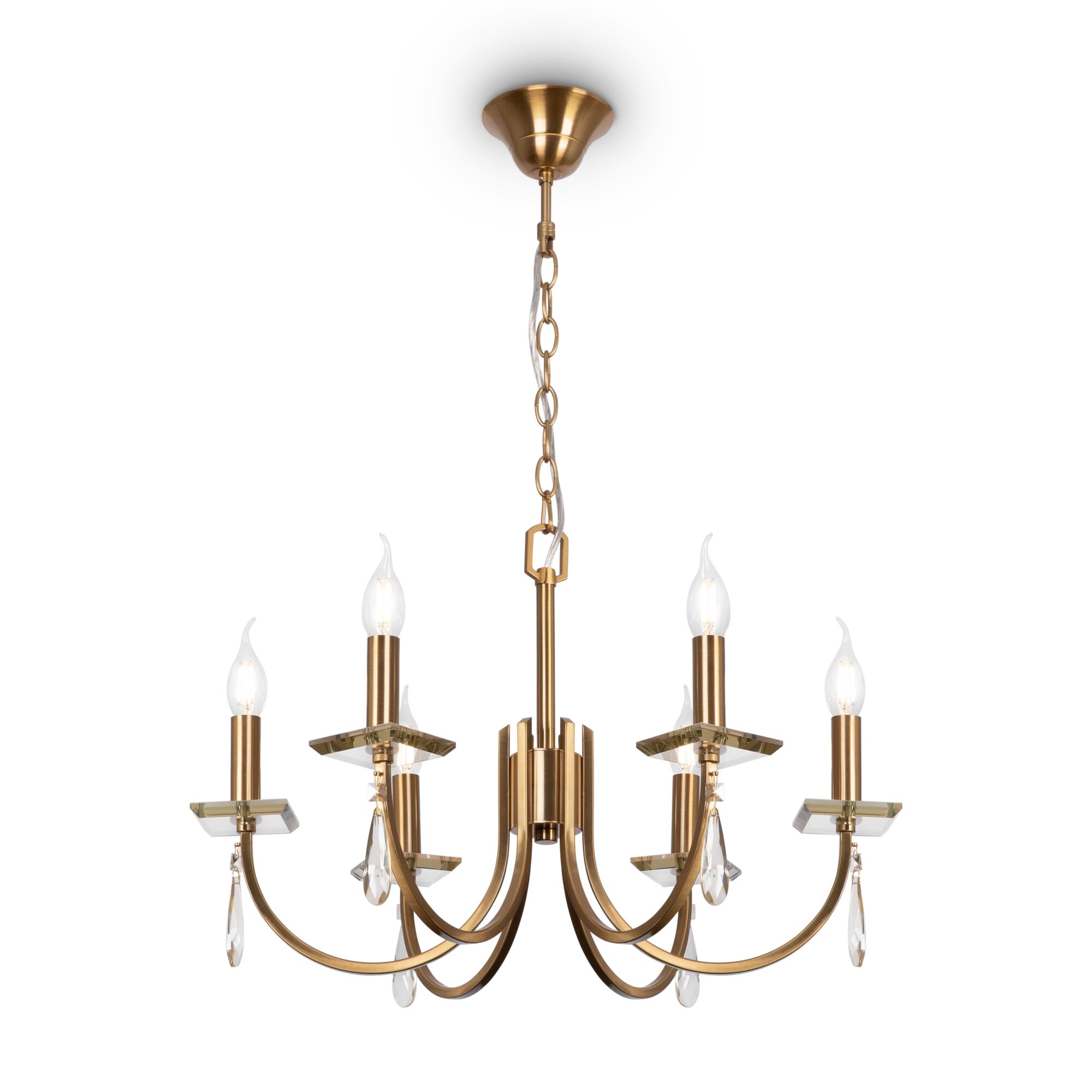 Металлическая арматура в двух оттенках: латунь и никель. Классическая форма плафона в виде свечи. Торшер и настольная лампа имеют тканевые абажуры. Белые – для арматуры цвета никель, оттенка кремовый шампань – для латунной. Декор – прозрачные хрустальные подвесы каплевидной формы. Торшер с цоколем Е27, лампа, бра и люстры – Е14.