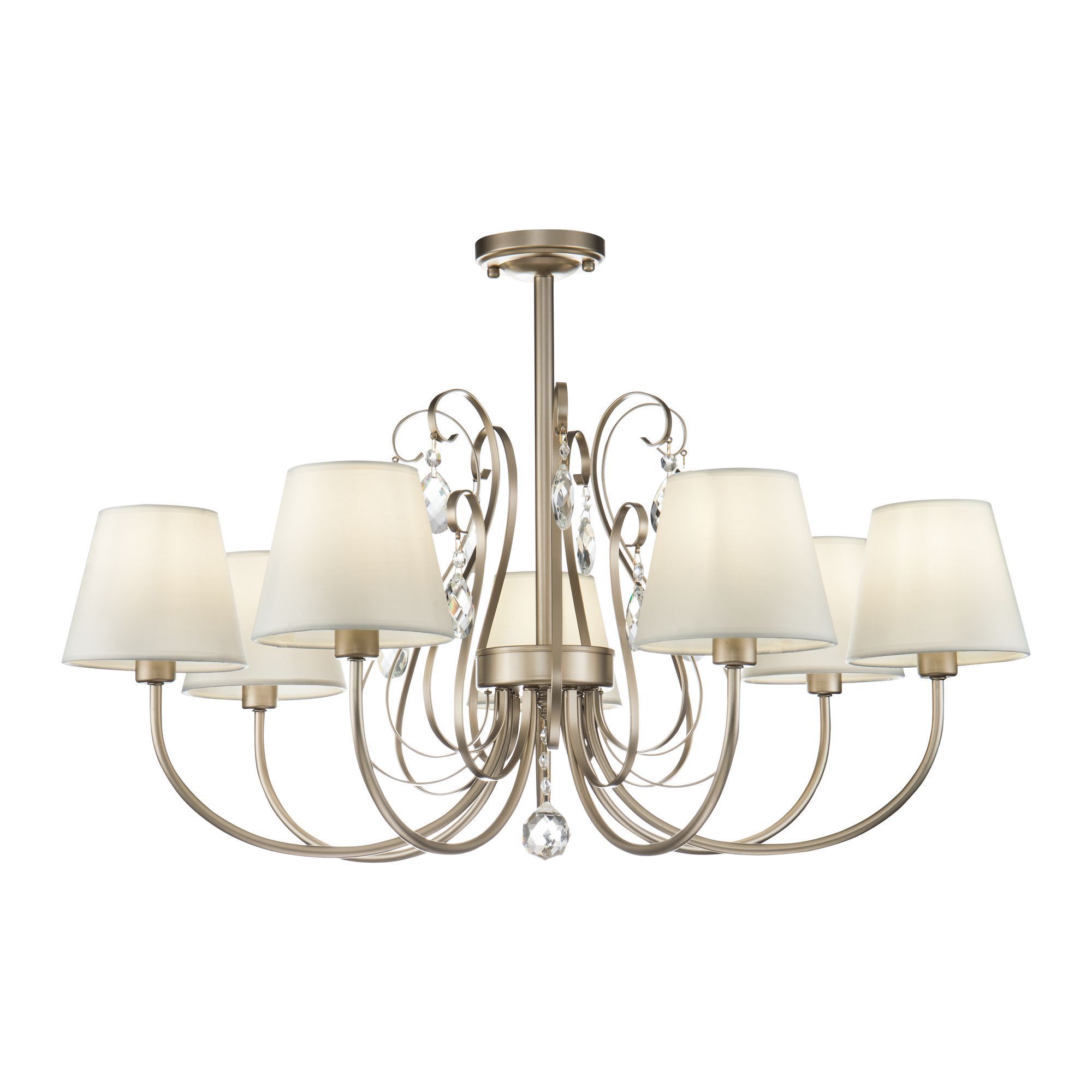 Серия Vanda выполнена в классическом стиле. Благодаря своему строгому и элегантному дизайну светильники могут дополнить интерьер гостиной, спальни и даже гардеробной комнаты. Металлическая арматура цвета матового золота, абажуры сделаны из белой ткани. Светильники украшены декоративными подвесками.