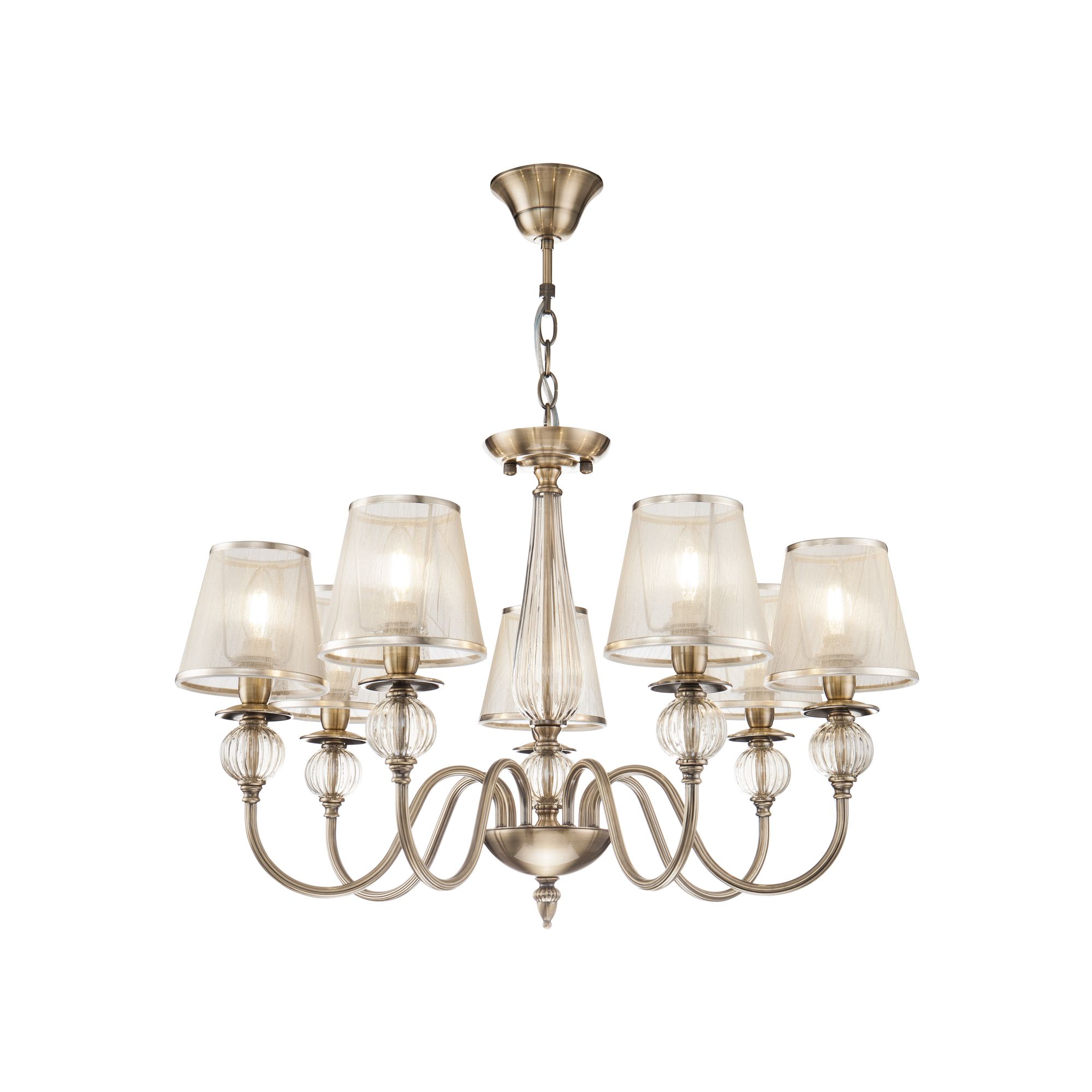 Серия в классическом стиле. Главное украшение светильников Inessa – декоративные элементы арматуры из прозрачного стекла коньячного оттенка. Абажуры выполнены из органзы и обрамлены тесьмой в цвет арматуры, сделанной из металла. Широкая линейка позволит осветить все зоны помещения в едином стиле.