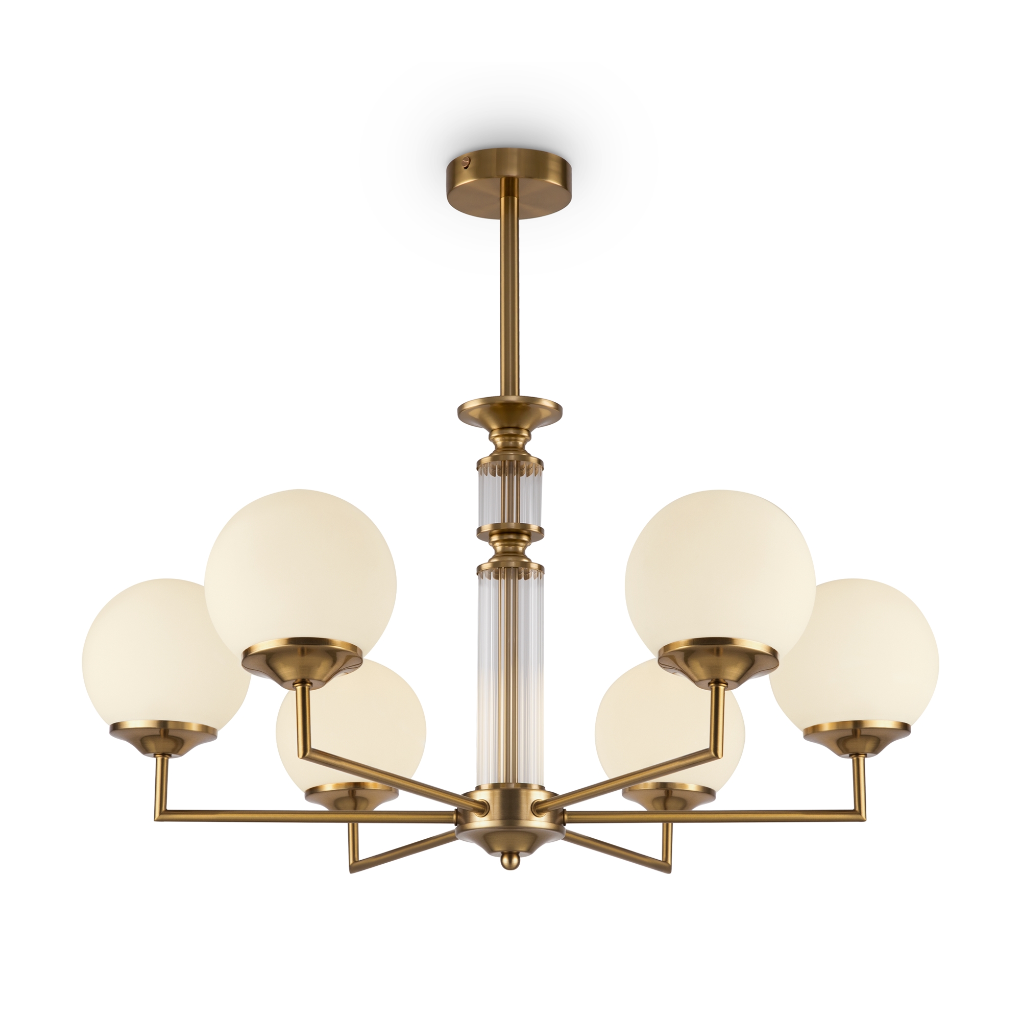 Металлическая арматура окрашена в цвет латуни. Плафоны-сферы из матового белого стекла. Декор – прозрачное рельефное стекло. Источник света – лампа с цоколем Е27.