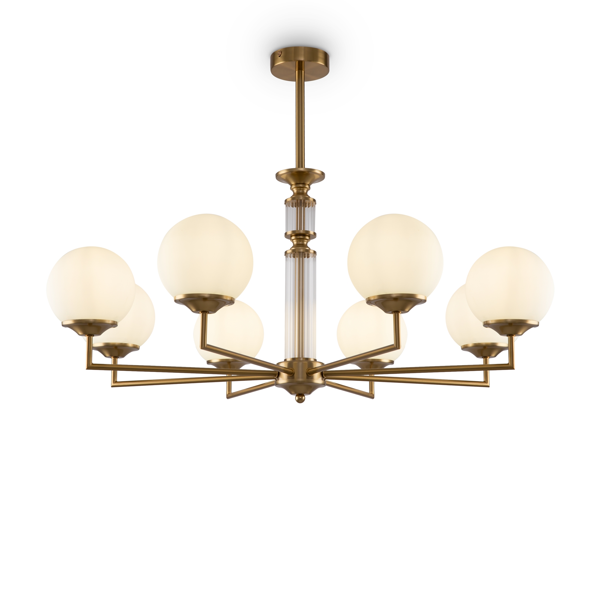 Металлическая арматура окрашена в цвет латуни. Плафоны-сферы из матового белого стекла. Декор – прозрачное рельефное стекло. Источник света – лампа с цоколем Е27.