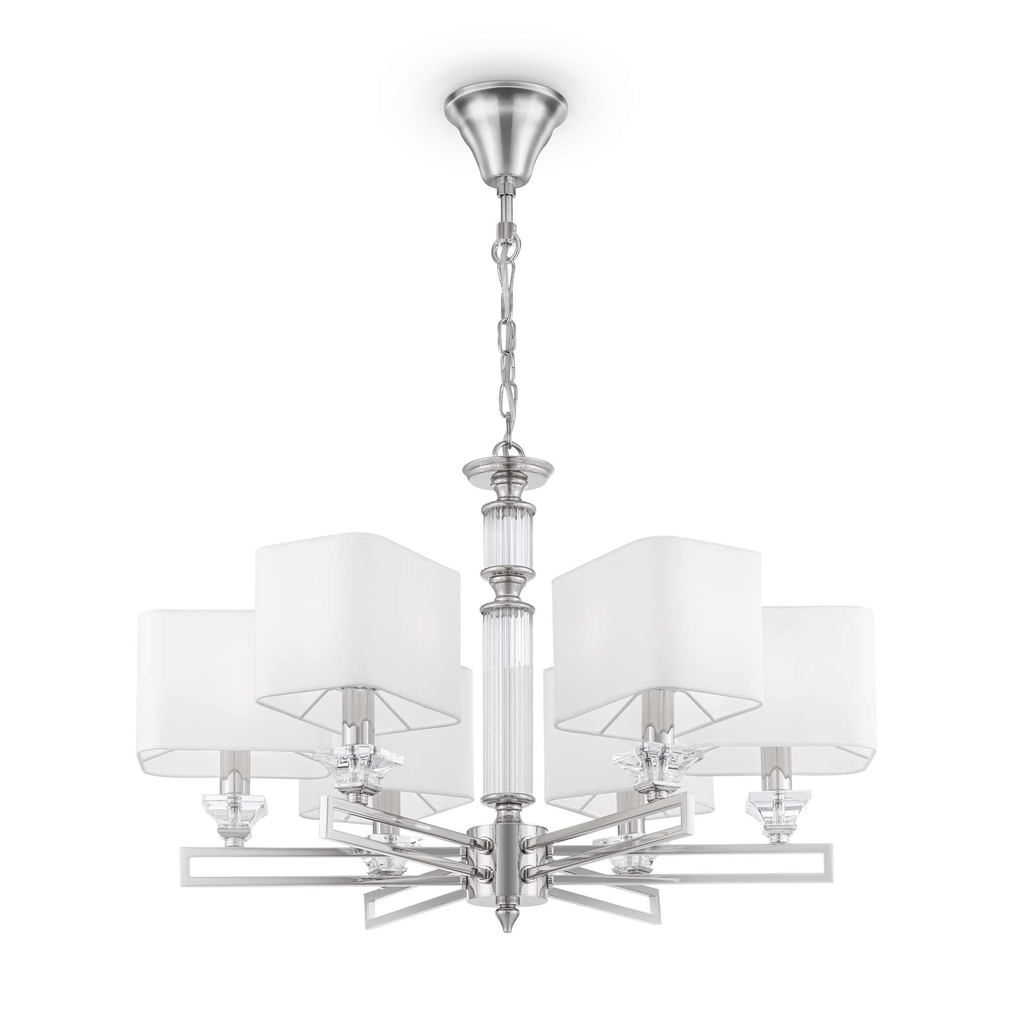 Хромированная металлическая арматура. Абажуры из белого текстиля, нанесенного на ПВХ. Стеклянный декор центральной части и розеток. Геометрические рожки.