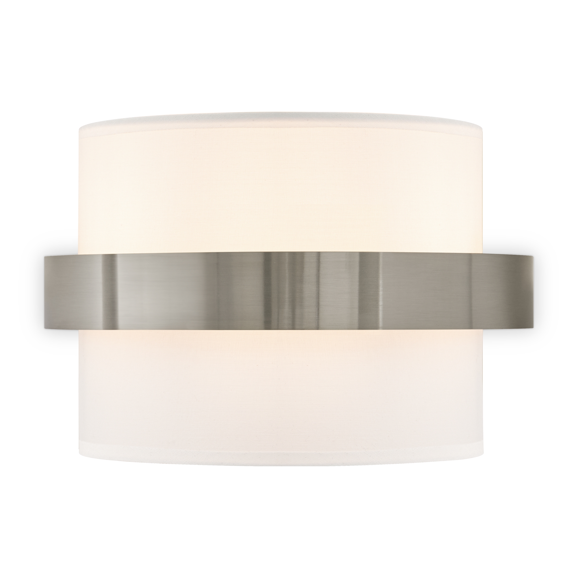 Цилиндрической формы абажур из ткани белого цвета. Декоративная парящая окантовка из металла в цвет арматуры. Регулируется по длине. Компактные размеры подходят для низких потолков и небольших интерьеров. Металлическая арматура, цвет - латунь и никель. Источник света — лампа с цоколем Е14, E27 и для настенного бра дополнительный LED с температурой свечения 3000 K.