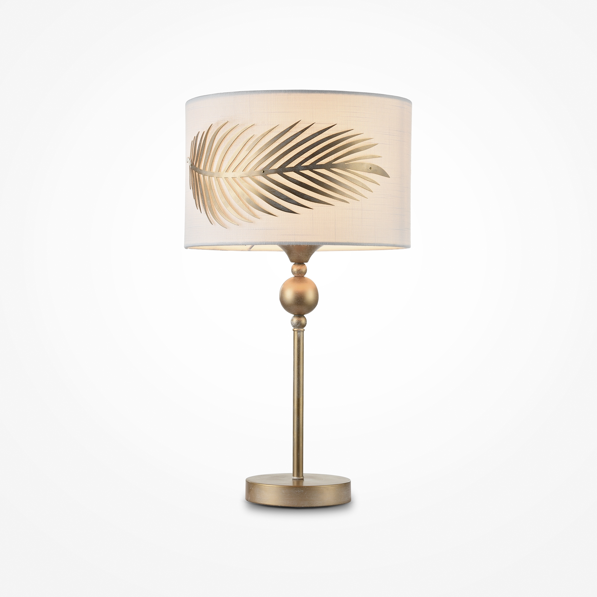 Арматура из металла, цвет – золото. Абажур – белый текстиль на ПВХ. Декор – пальмовая ветвь из листового металла. Рассеиватель фиксируется декоративным наконечником. Высота люстр регулируется.