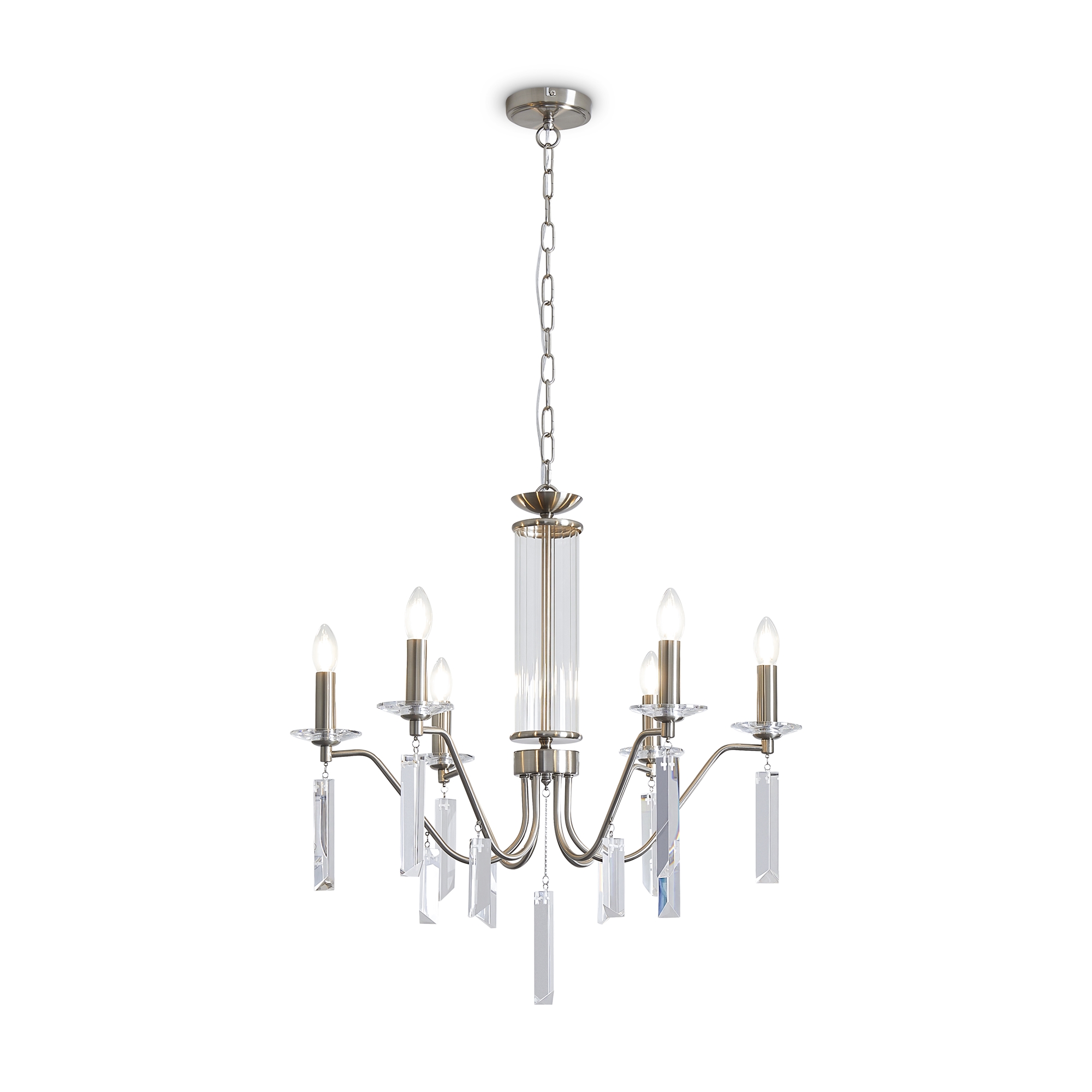 Материал арматуры — металл, цвет — никель или латунь. Подвесные светильники с цоколем E14. Доступны с пятью или шестью источниками света. Грани хрустальных подвесов создают эффект перелива радуги. Центральный декор из стеклянных трубок. Подходит для классических интерьеров.