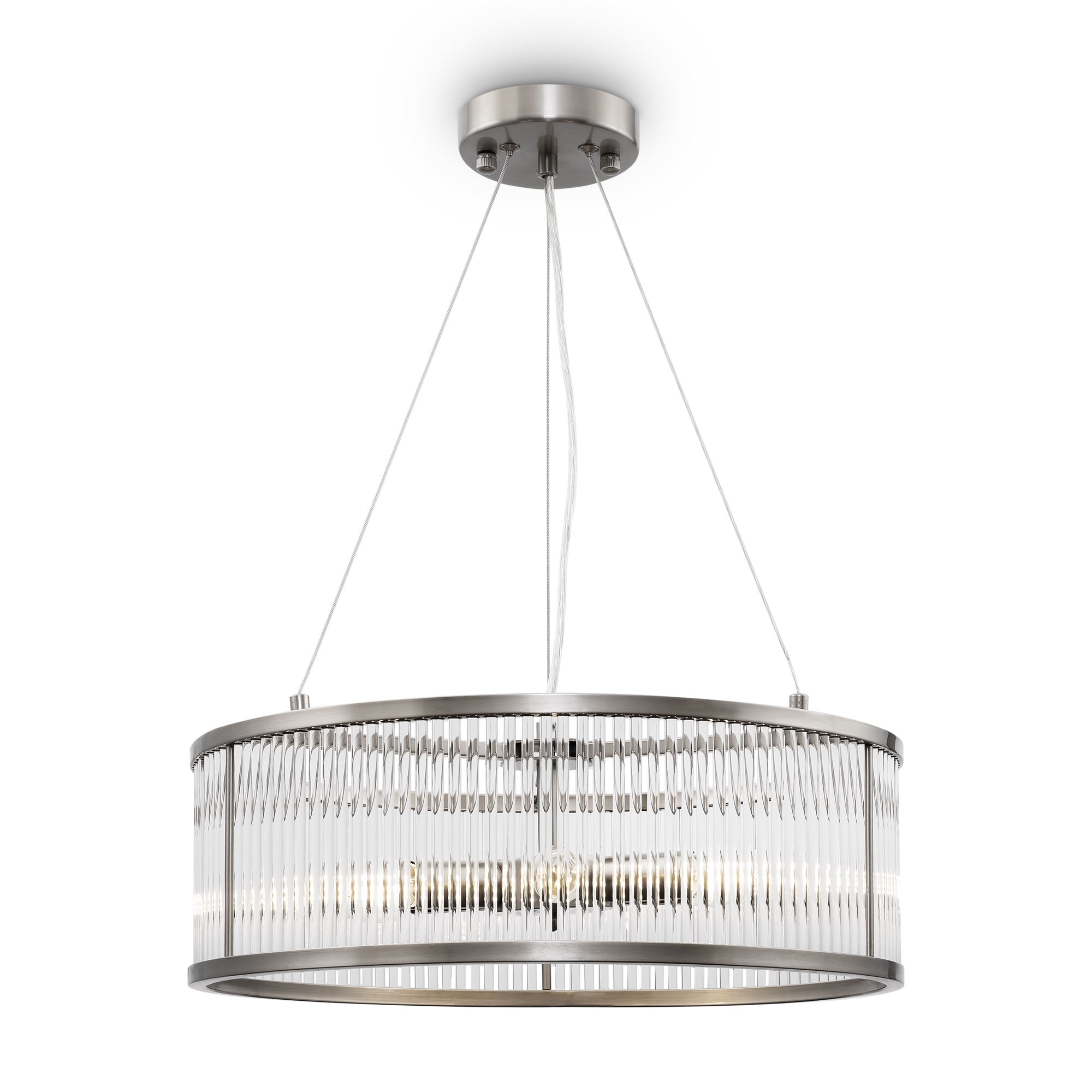 Арматура из металла. Оттенки – латунь, никель. Декор – прозрачные стеклянные трубки, зафиксированные на кольцевой арматуре (у бра – форма полусферы). Высота люстр регулируется. Источник света – лампа с цоколем Е14.