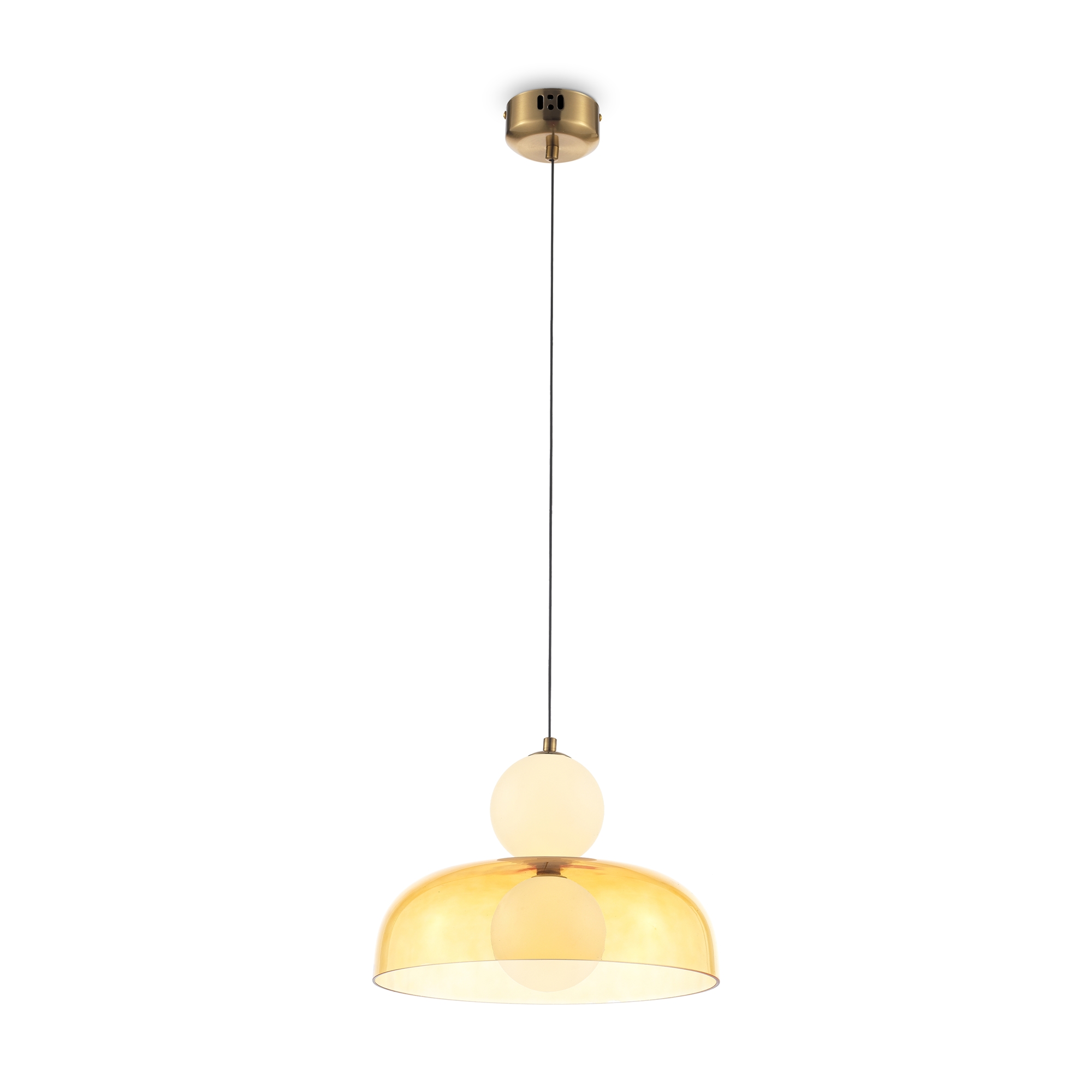 Арматура - металл, цвет - латунь. Стеклянные плафоны в виде сдвоенных матовых “шариков” дополнены широкими декоративными плафонами из стекла двух оттенков: дымчатый и янтарный. LED-источник света. Цветовая температура - 3000К. Светильники подойдут для светлых интерьеров и детских комнат.
