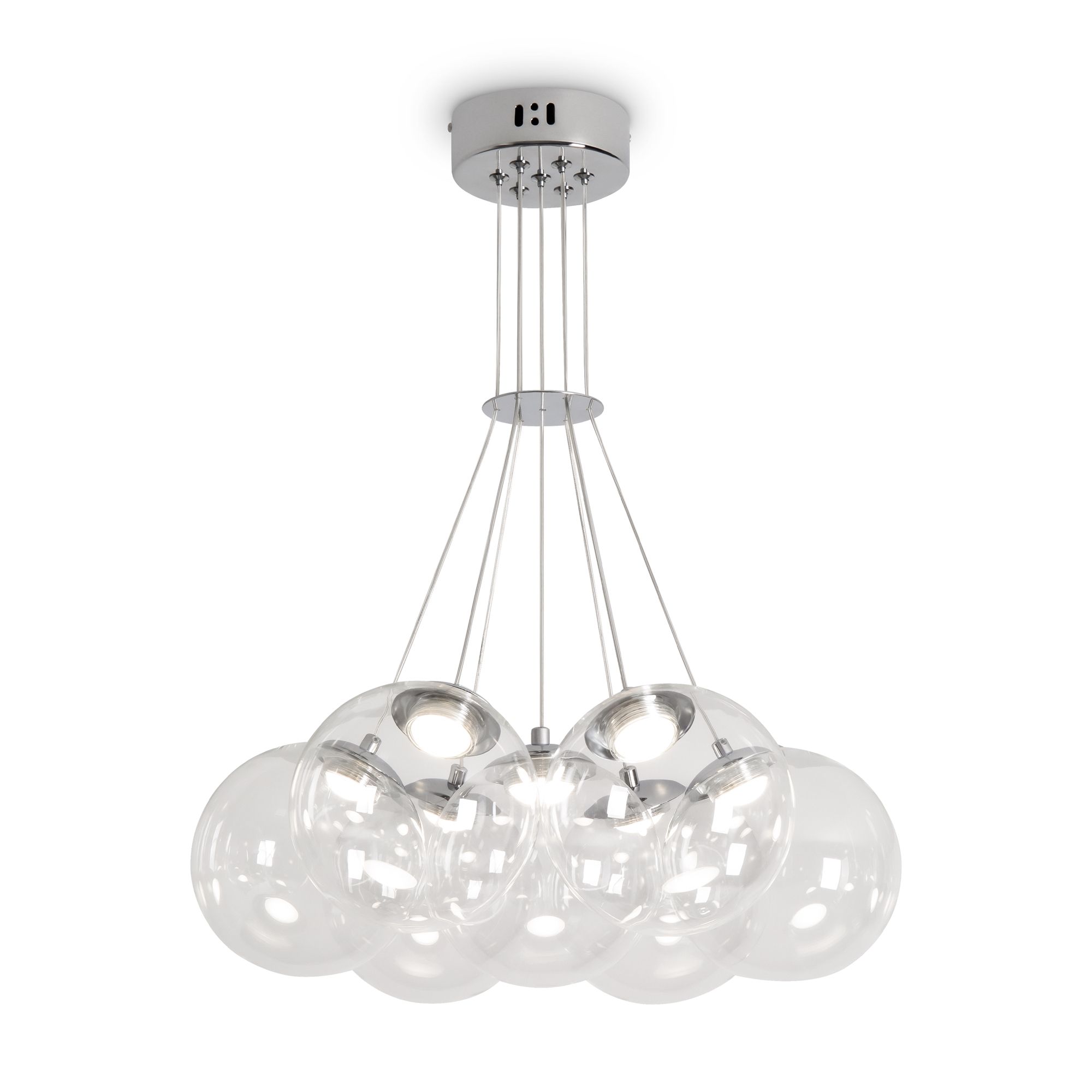 Арматура - металл (никель). Абажуры из дутого стекла с LED (2800K). Прозрачные плафоны подчеркивают современный дизайн. Высота 500-2500 мм. Серия станет ярким акцентом в вашем интерьере.