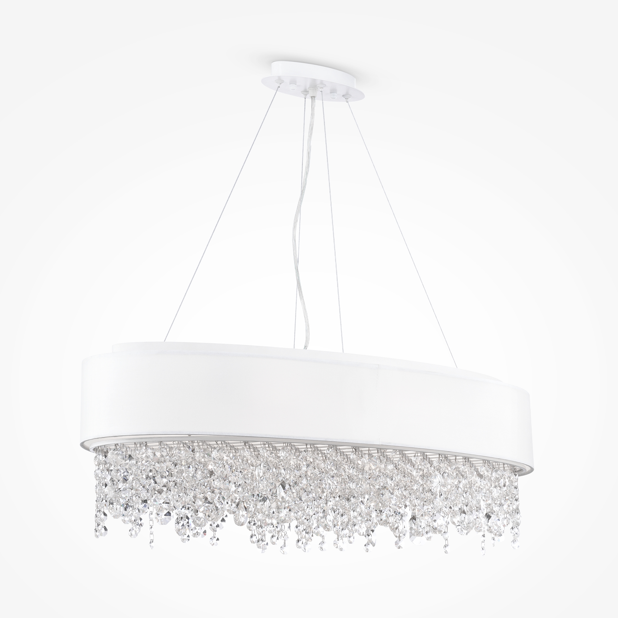 Металлическая арматура в белом цвете. Абажур – ткань, нанесенная на ПВХ, цвет – белый. Декор – подвески в виде граненых кристаллов. Высота подвесных светильников регулируется тросом.