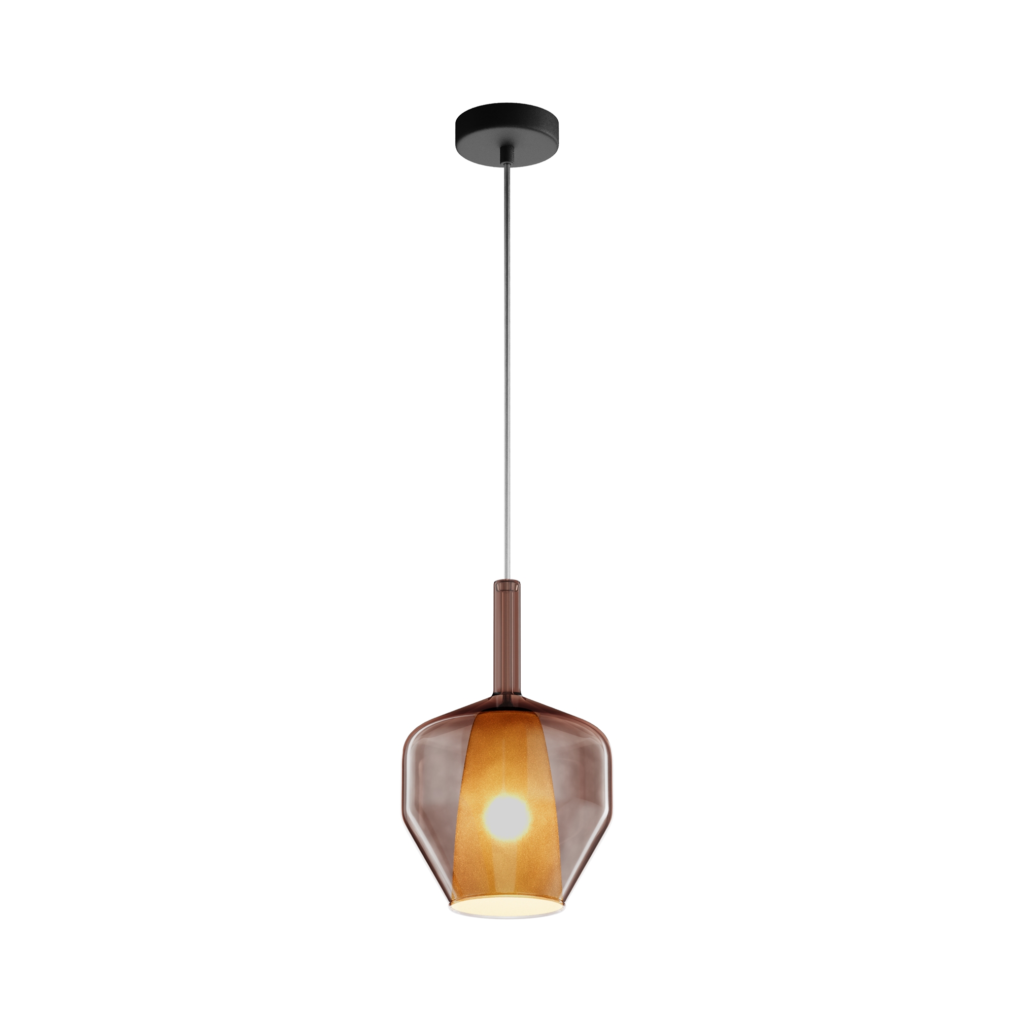 Металлическое основание, цвет — черный. Двойные стеклянные плафоны. Многообразные геометрические формы плафонов. Цвет стекла: зеркальный золотой, кофейный и дымчатый, а также градиентный белый. Регулируемая длина провода — 3 метра. Источник света — лампа с цоколем Е27.