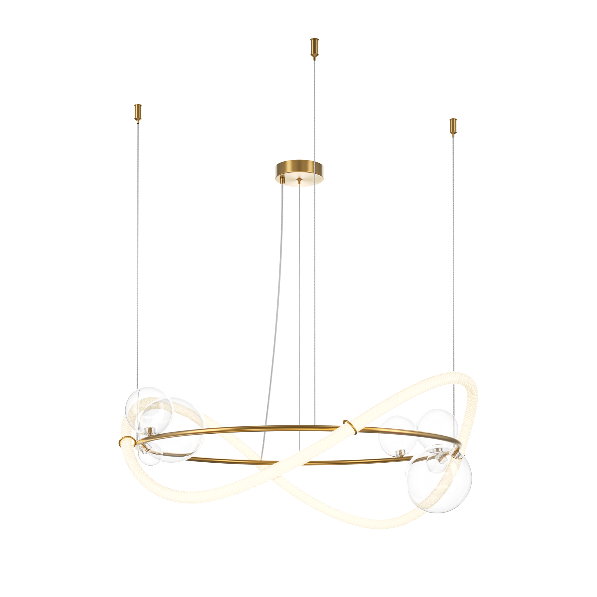 Арматура из металла цвета латуни, материал рассеивателя – текстильный жгут, декоративные элементы выполнены из прозрачного выдувного стекла. LED-источник света. Цветовая температура 3000К, угол рассеивания света 360°. Вертикальное настенное бра включается touch-сенсором. Тканевый шнур. Высота подвесных светильников регулируется.