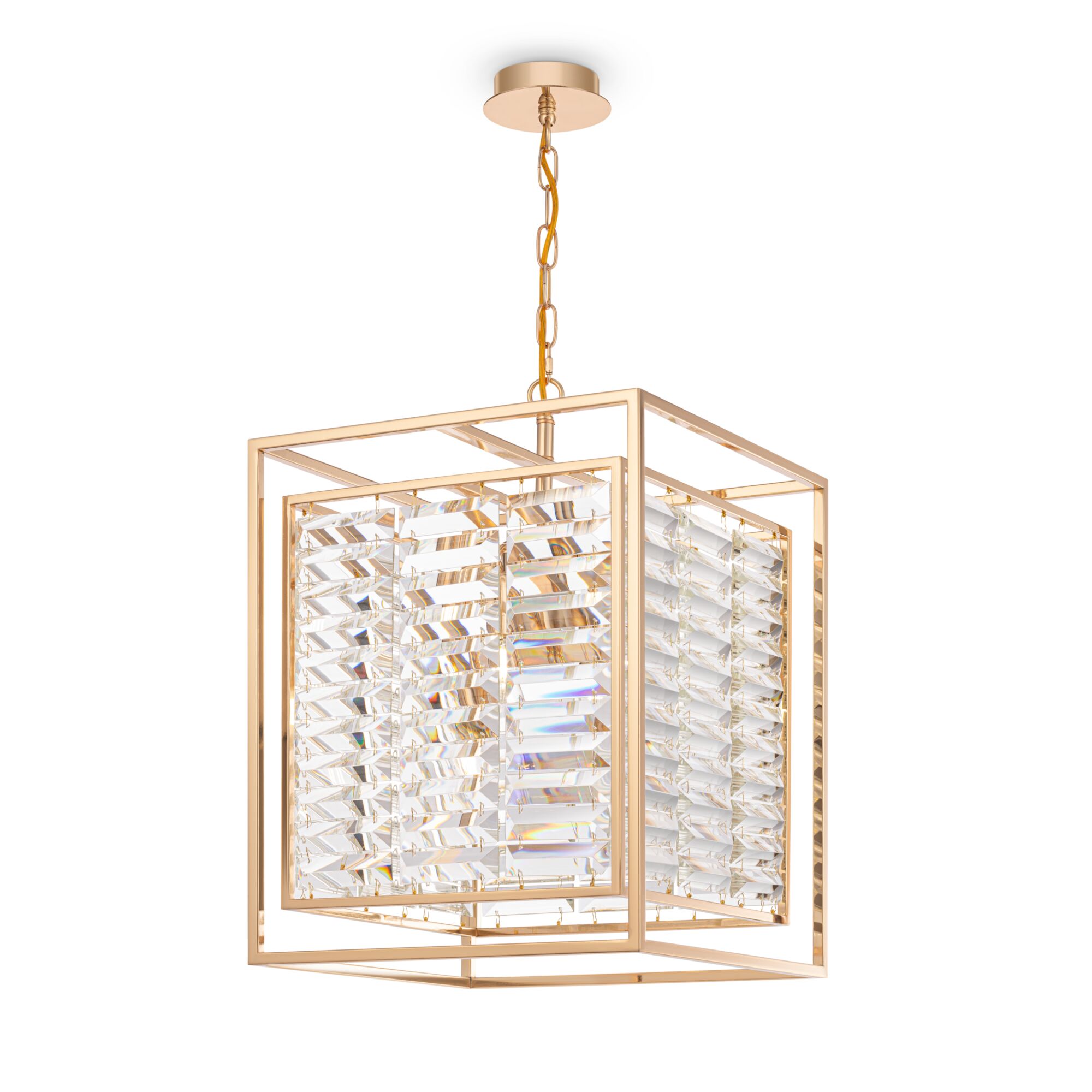 Арматура – металл, оттенки – хром, золото. Двойной геометрический плафон. Металлический каркас плафона окрашен в тон арматуре. Декор – стеклянные кри сталлы с трапециевидной огранкой. Высота подвесных моделей регулируется.