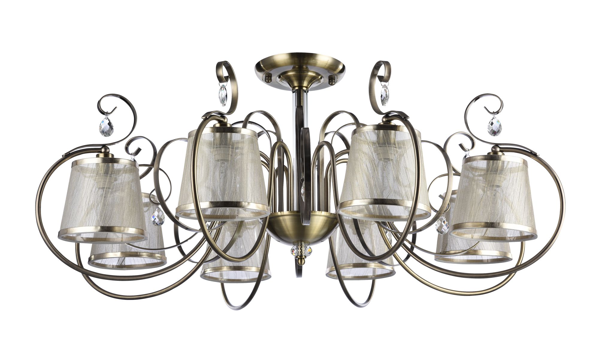 Светильники серии Simone выполнены в классическом стиле. Арматура цвета «античное серебро», абажуры из органзы на ПВХ. Люстры подходят для помещений с невысокими потолками благодаря конструкции «2 в 1». Дизайн изделий дополнен декоративными подвесками.