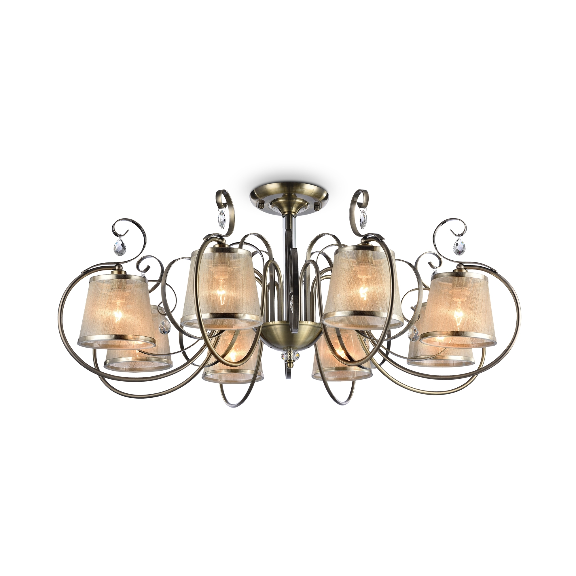 Абажуры и арматура светильников выполнены в разных цветах, с несколькими видами арматуры. Основание люстры украшено стеклянным декоративным элементом, а завитки рожков украшают подвески.