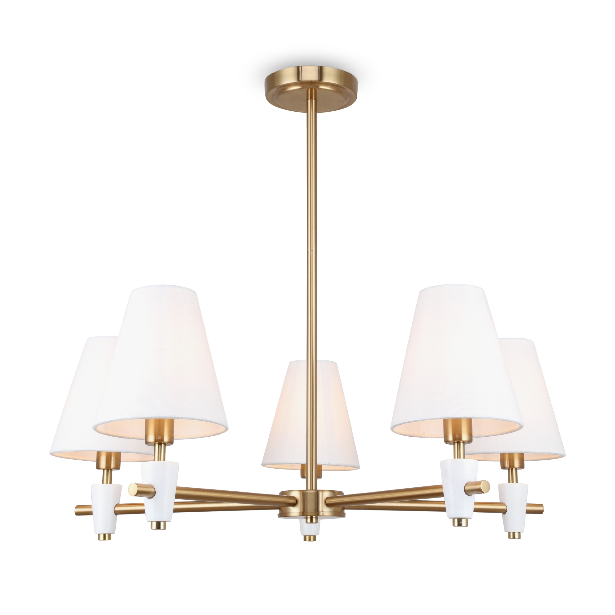 Металлическая арматура в цвете латунь. Дополнительные элементы — минималистичные вставки из натурального белого мрамора. Белые абажуры из ткани в форме конуса. Источник света — лампа с цоколем Е14 или Е27.