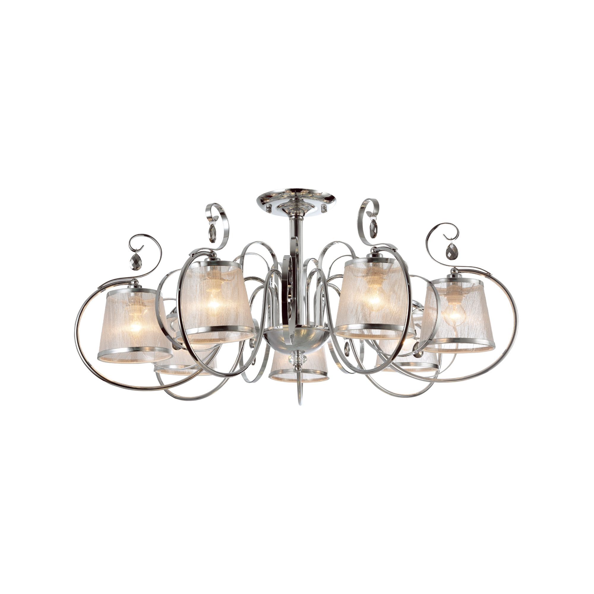Абажуры и арматура светильников выполнены в разных цветах, с несколькими видами арматуры. Основание люстры украшено стеклянным декоративным элементом, а завитки рожков украшают подвески.