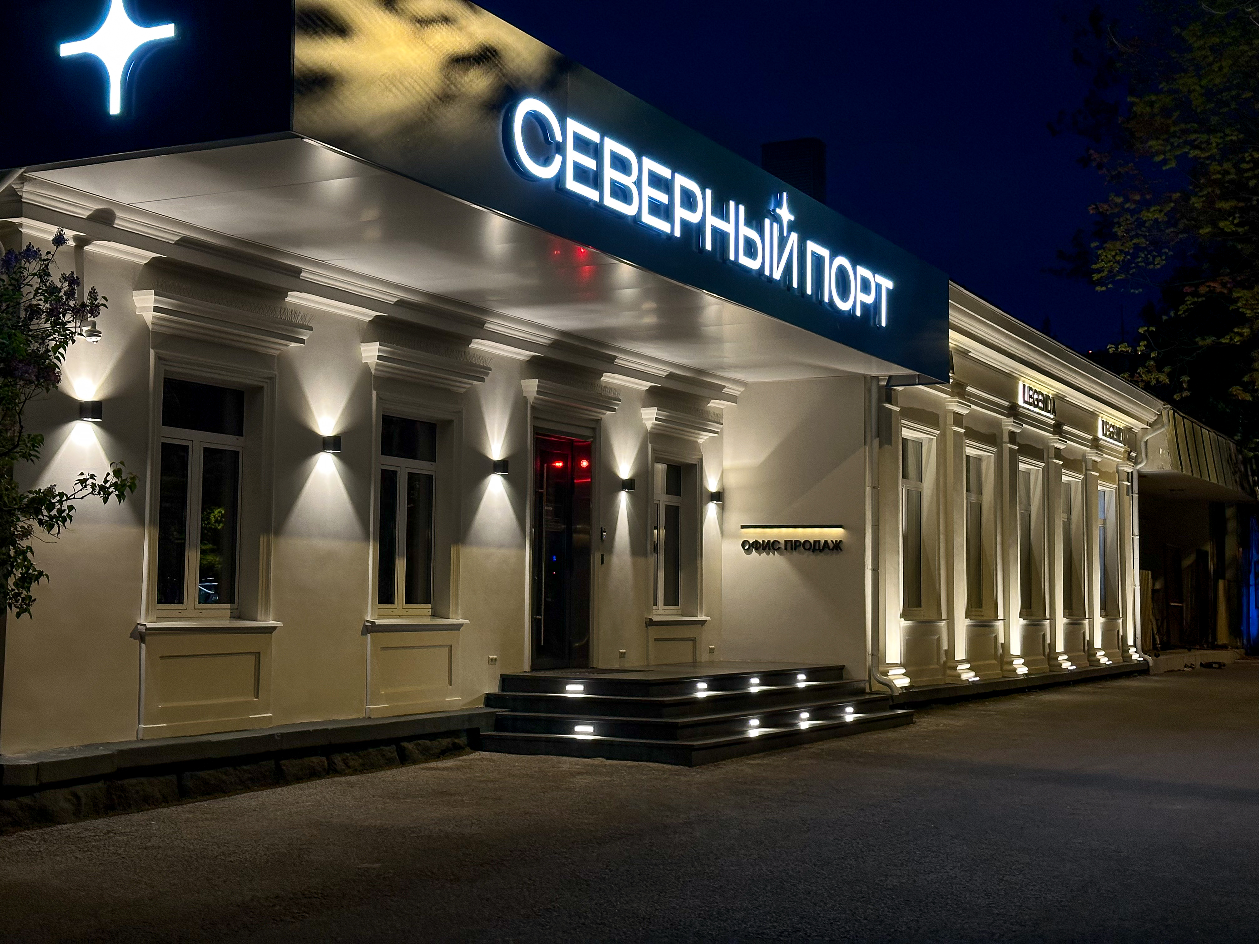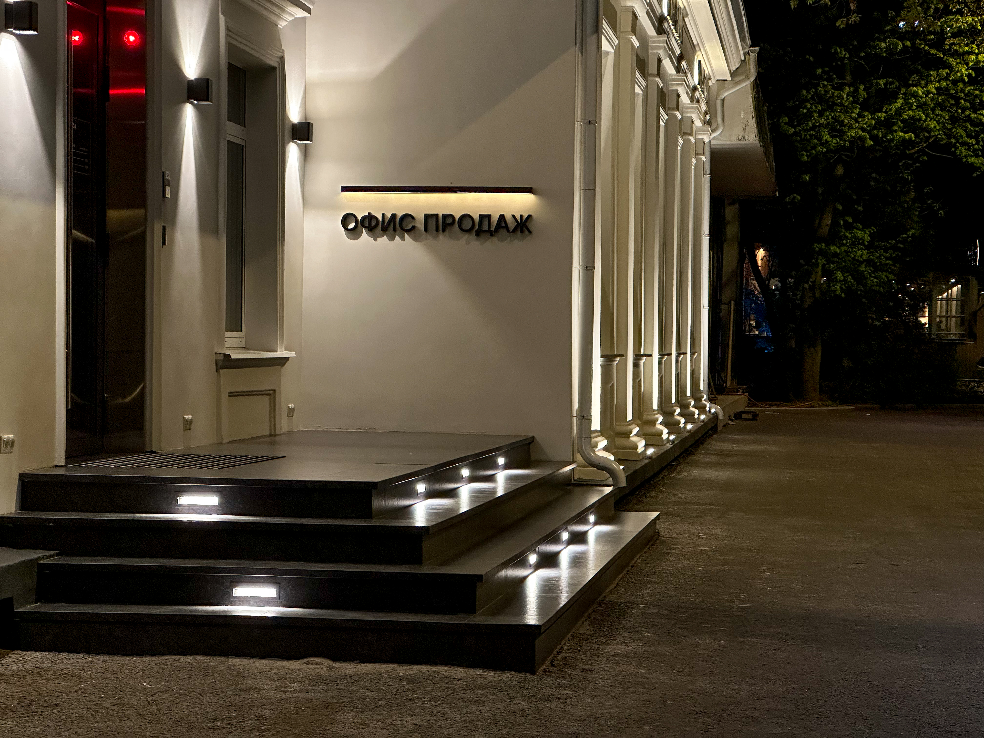 Для оформления архитектуры и навигационных были использованы светильники с разным назначением, но общим эффектом — чистый, тёплый, продуманный свет.