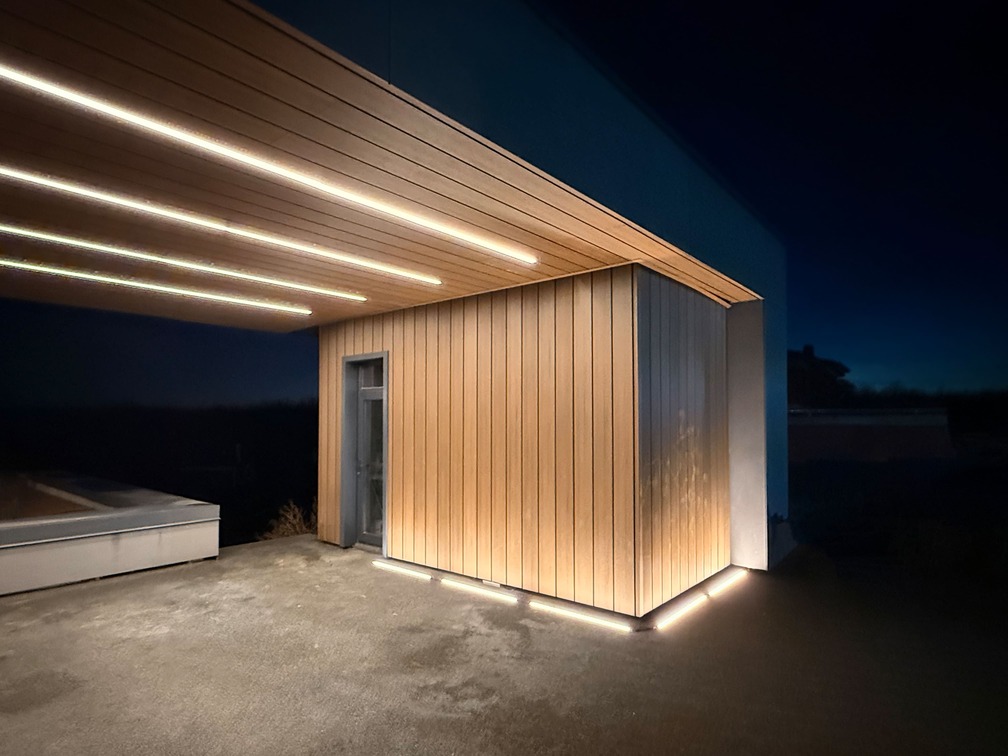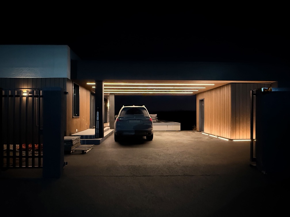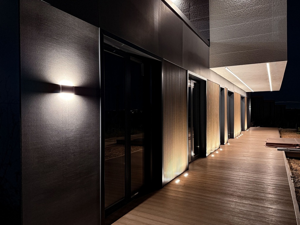 Оптимизация фасадного освещения была выполнена за счёт точного подбора светильников, цветовой температуры и их расположения. В результате дом выделяется среди застройки поселка выразительным вечерним образом, что напрямую повышает его инвестиционную привлекательность.