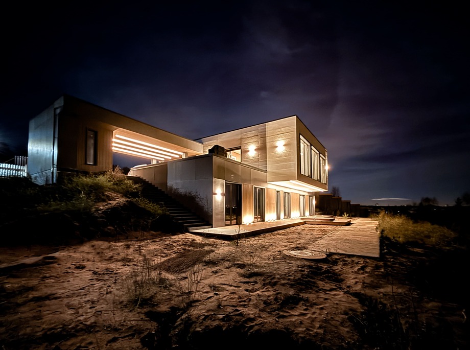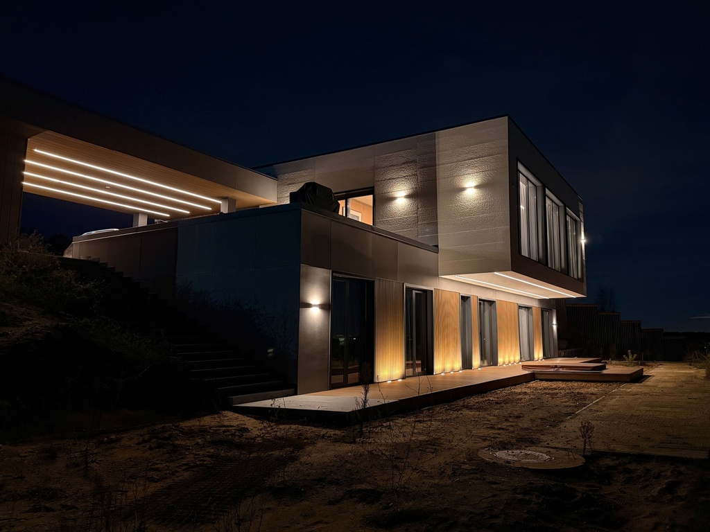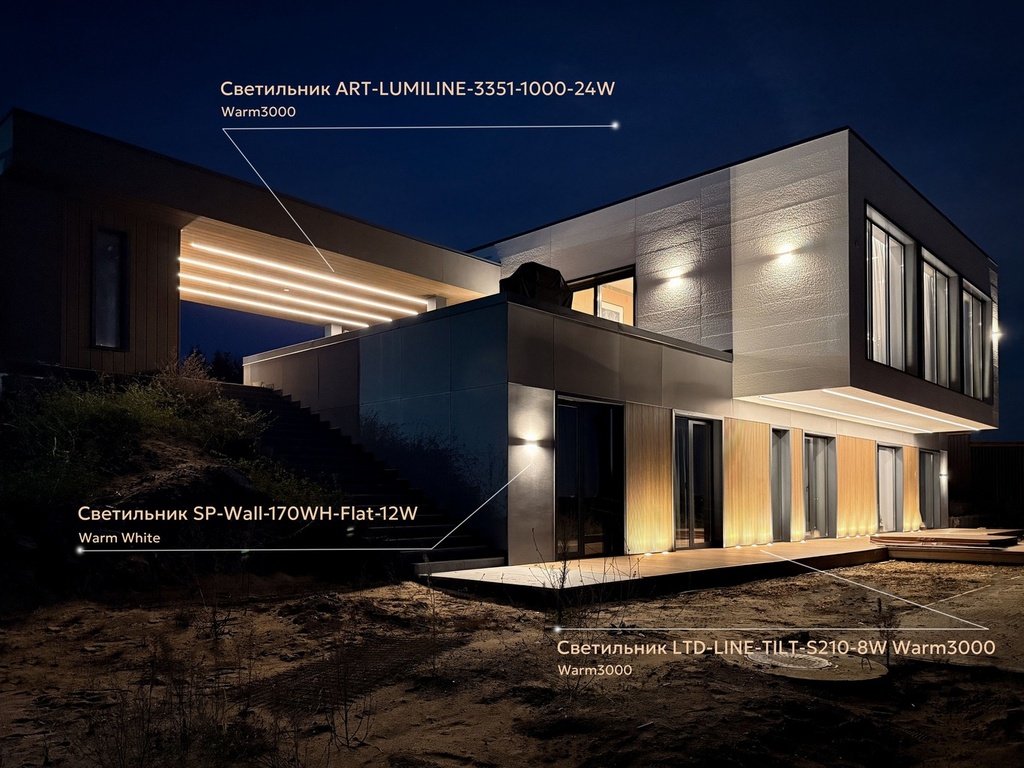 Все источники света подобраны с тёплой цветовой температурой 3000K, что подчёркивает текстуру и цвет материалов фасада и формирует премиальный вечерний сценарий без избыточной яркости.