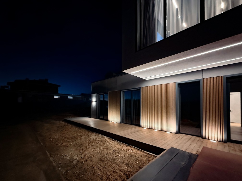 Все источники света подобраны с тёплой цветовой температурой 3000K, что подчёркивает текстуру и цвет материалов фасада и формирует премиальный вечерний сценарий без избыточной яркости.