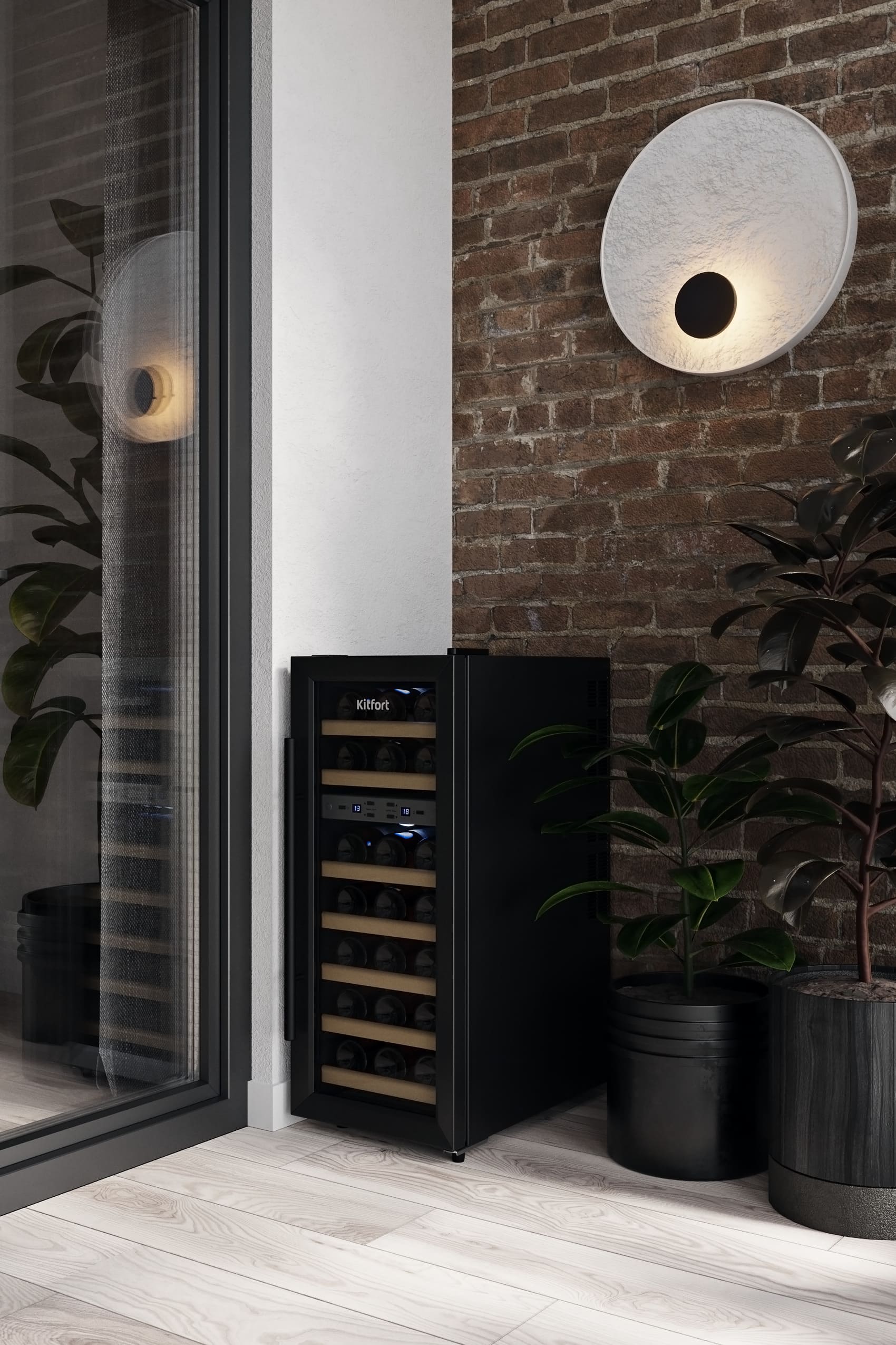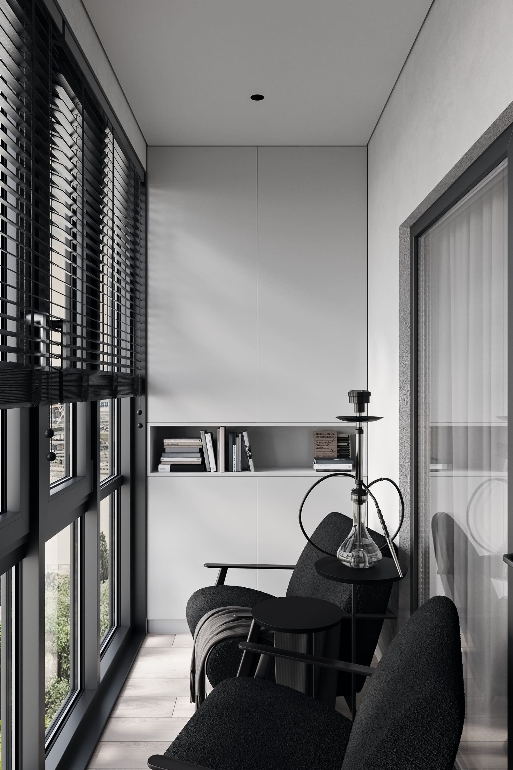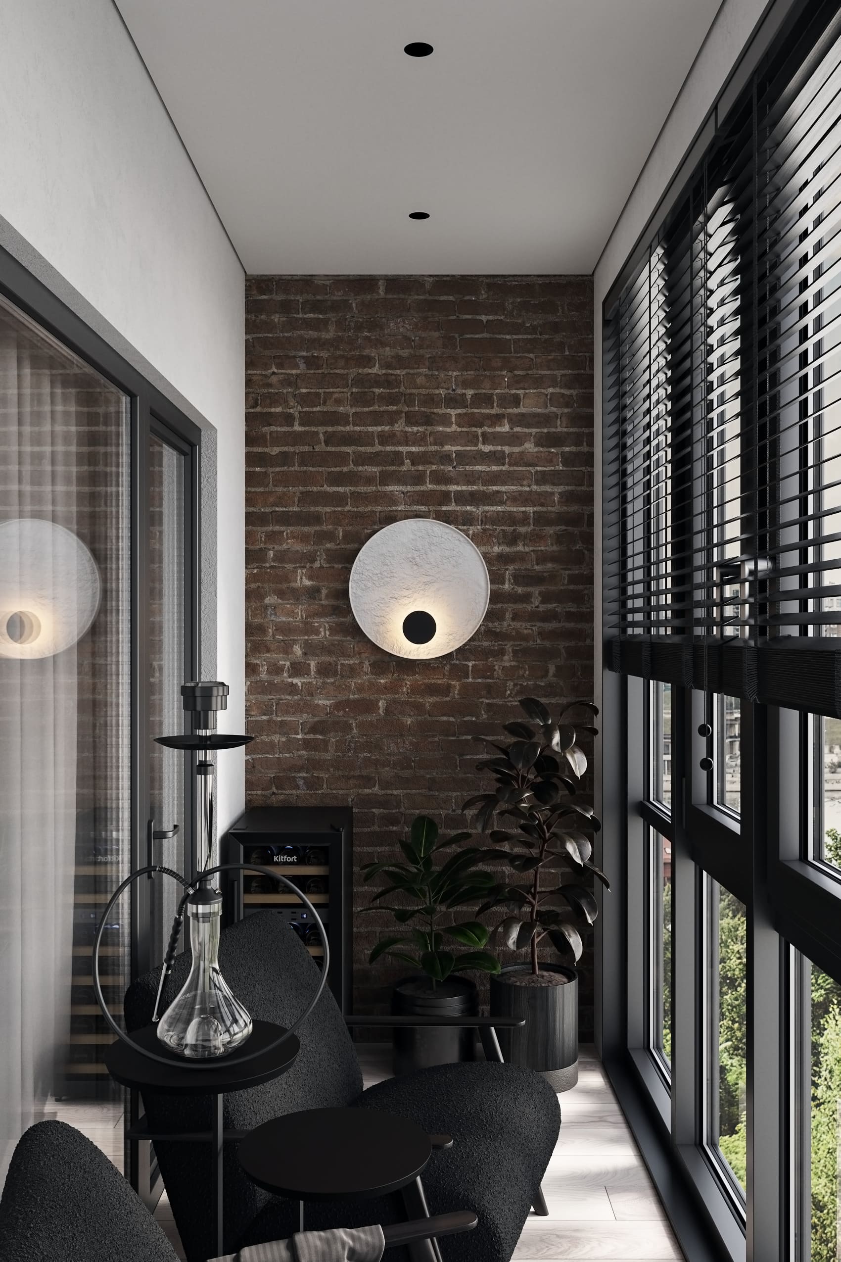 Лоджия оформлена как функциональная зона отдыха и хранения. Кирпичная стена, черная мебель, встроенное освещение и винный холодильник формируют компактное, практичное пространство с индустриальным характером.