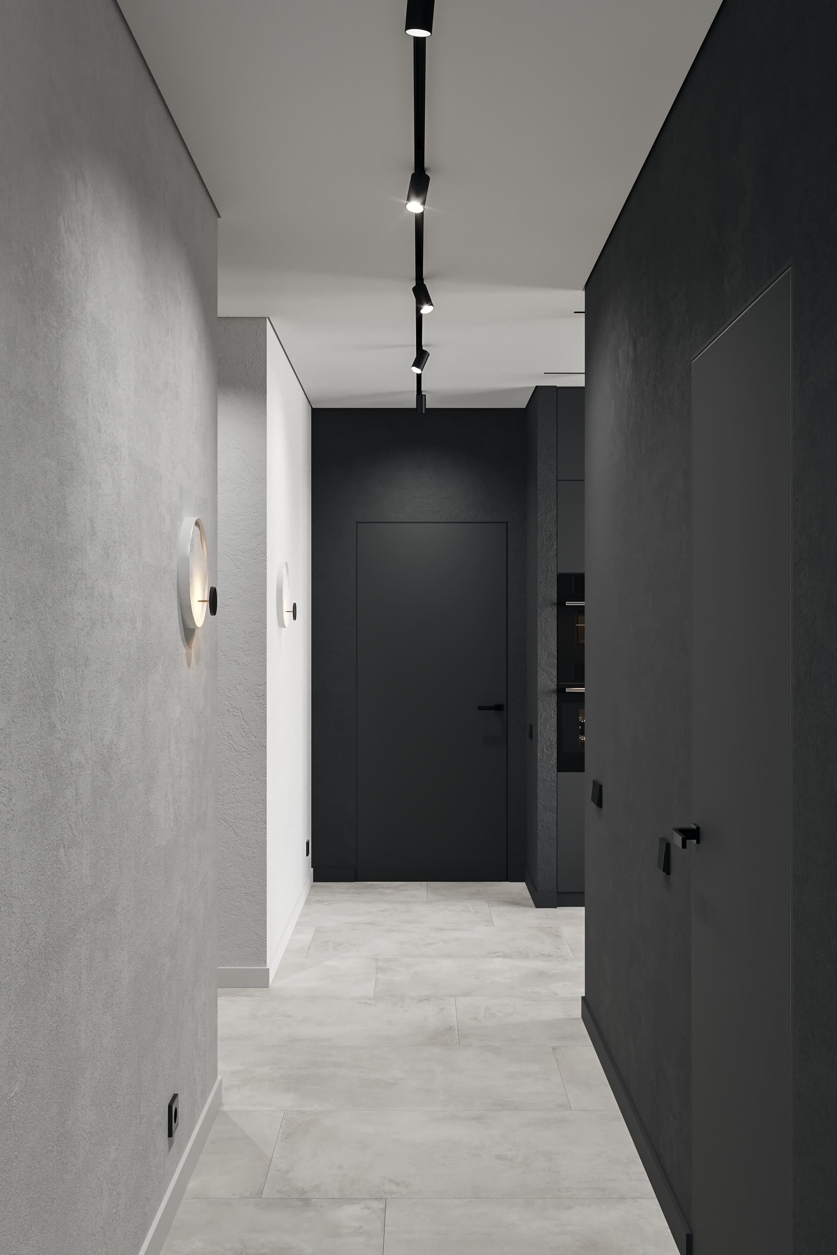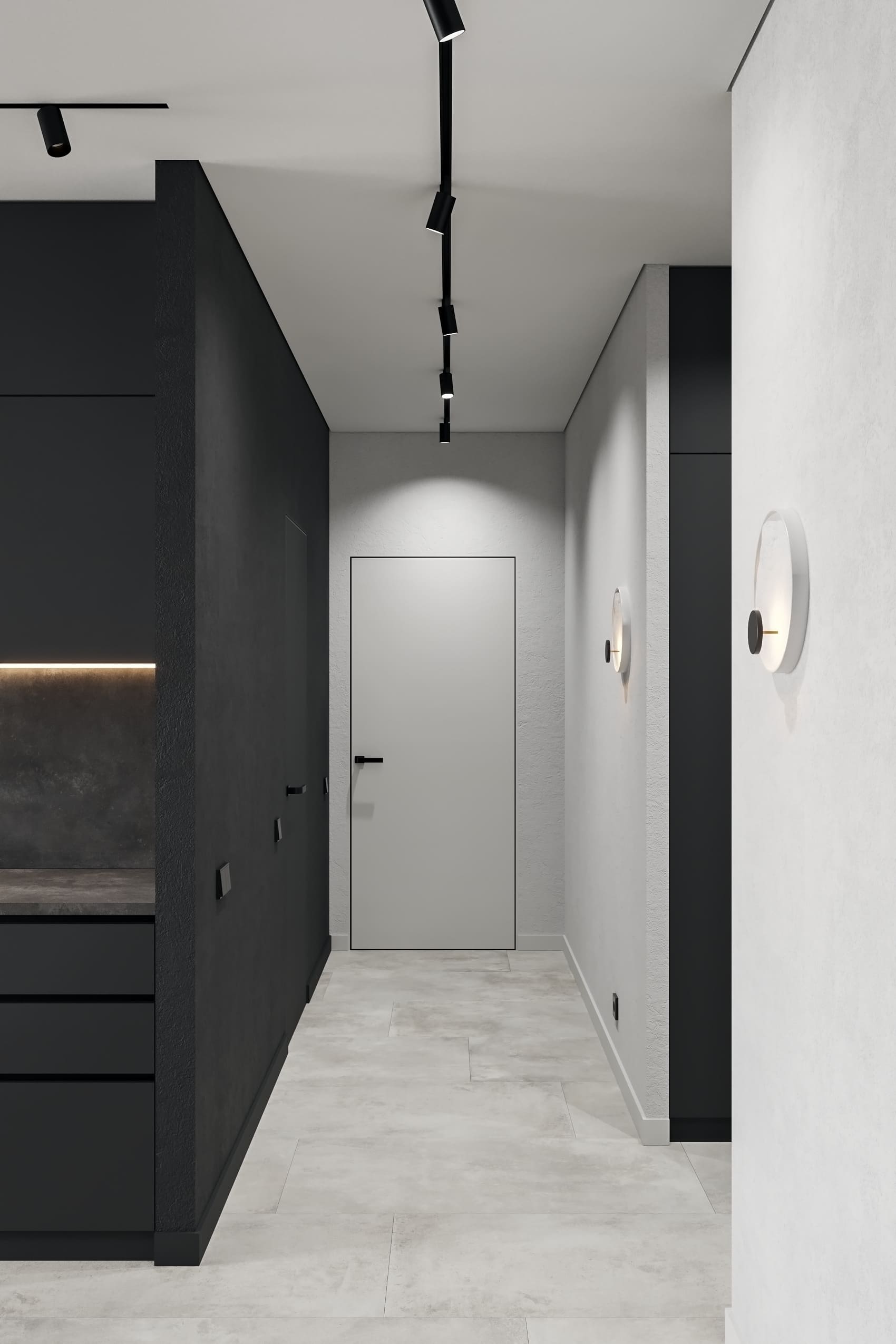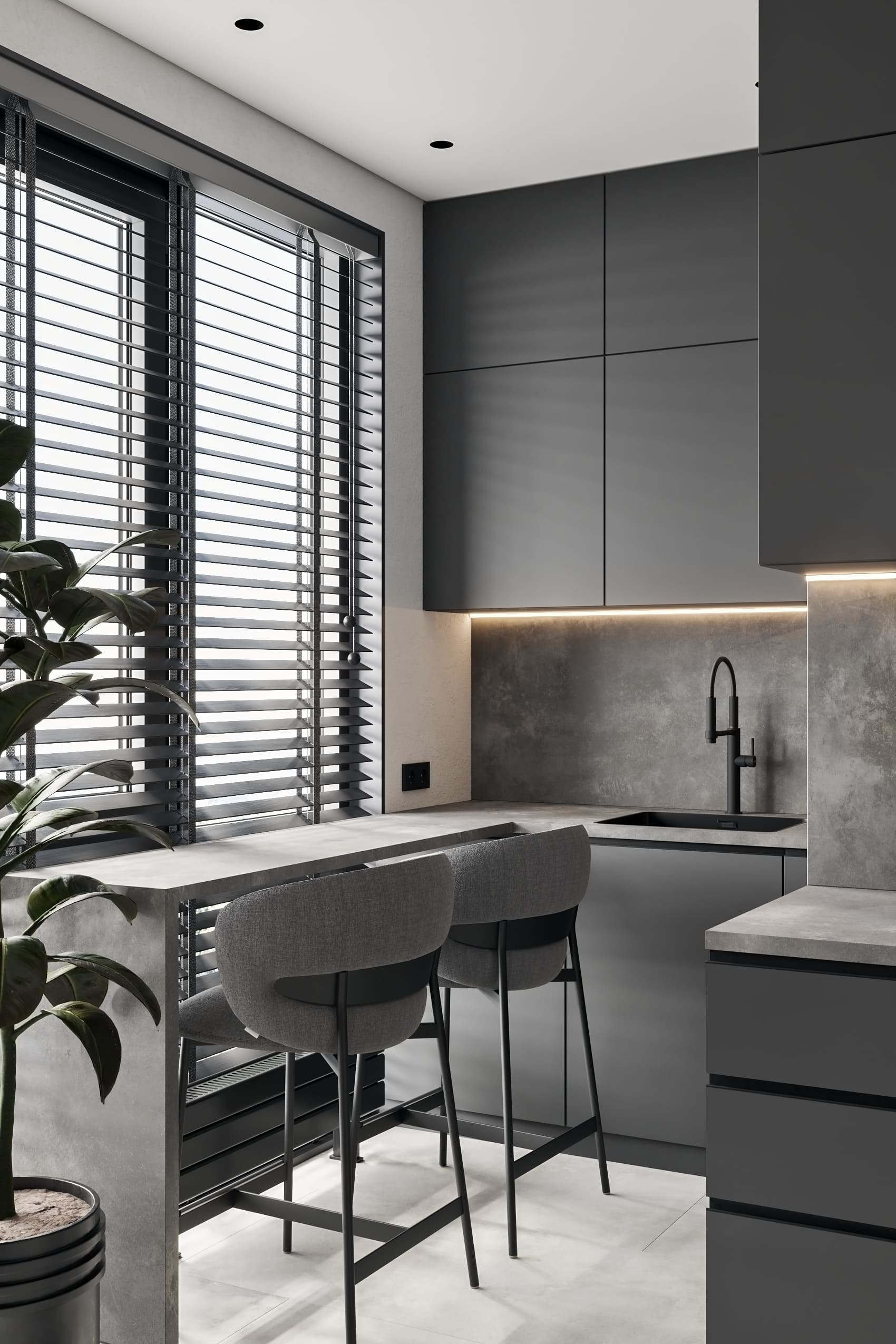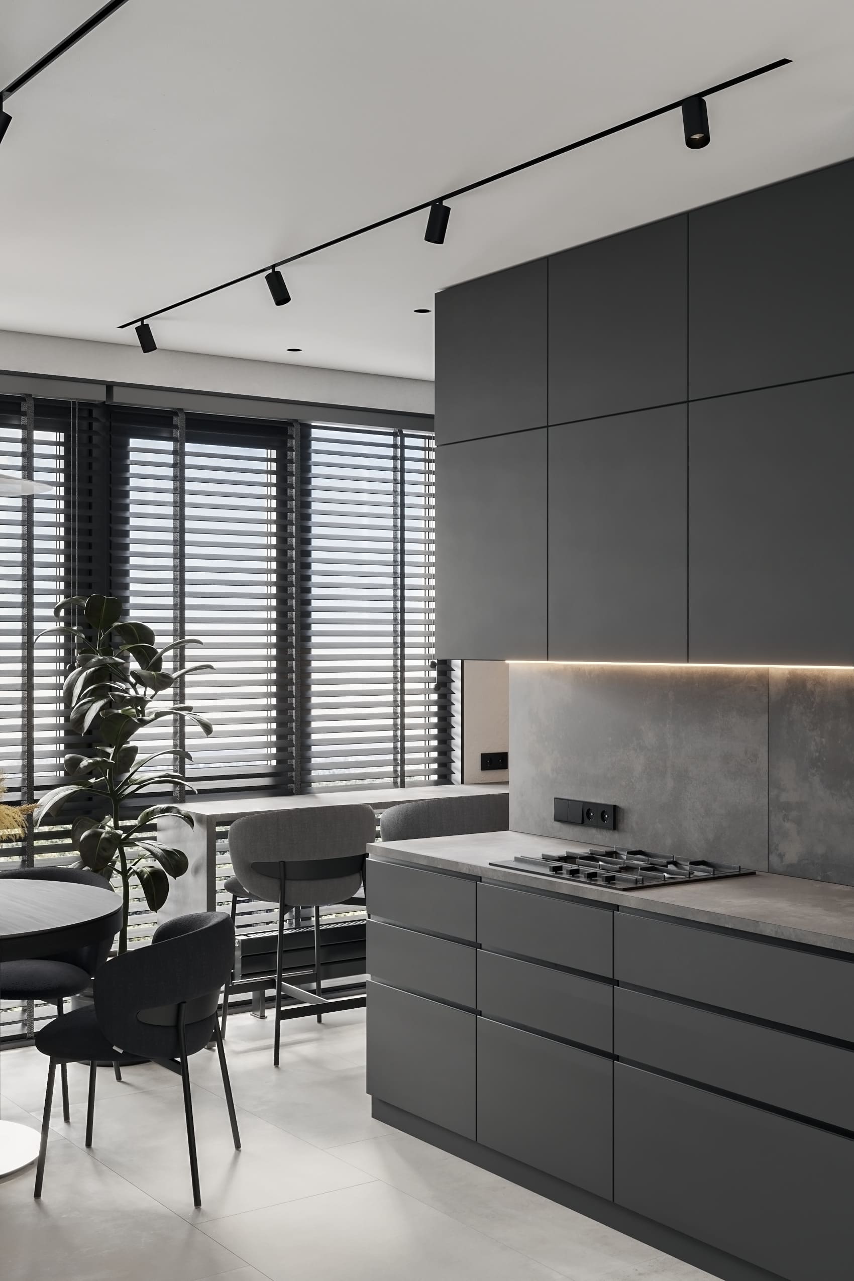 Проект выполнен в формате кухни-столовой с примыкающими зонами санузла и лоджии. Интерьер в современном минимализме с элементами лофта и акцентом на функциональность и чистую геометрию.