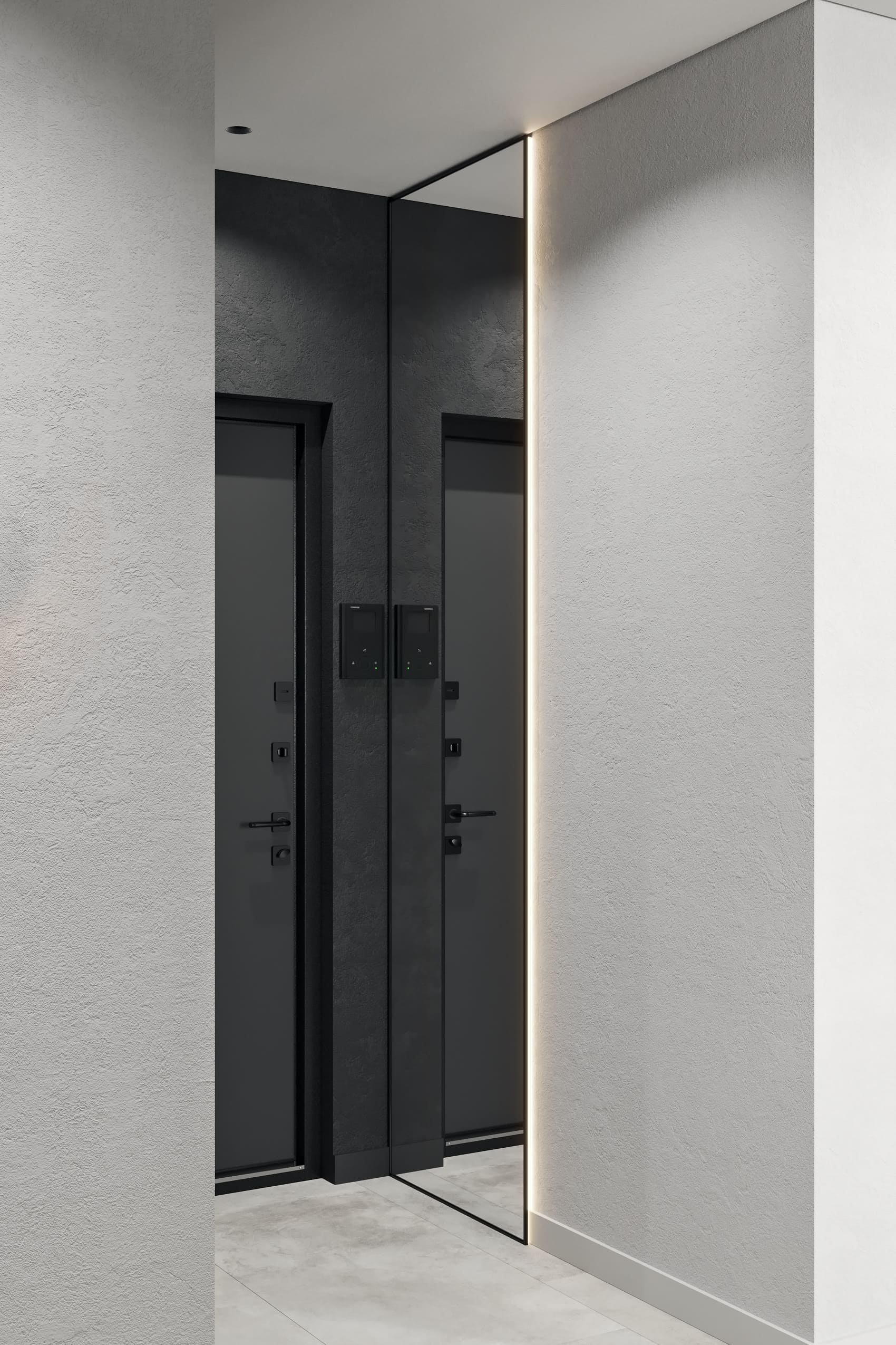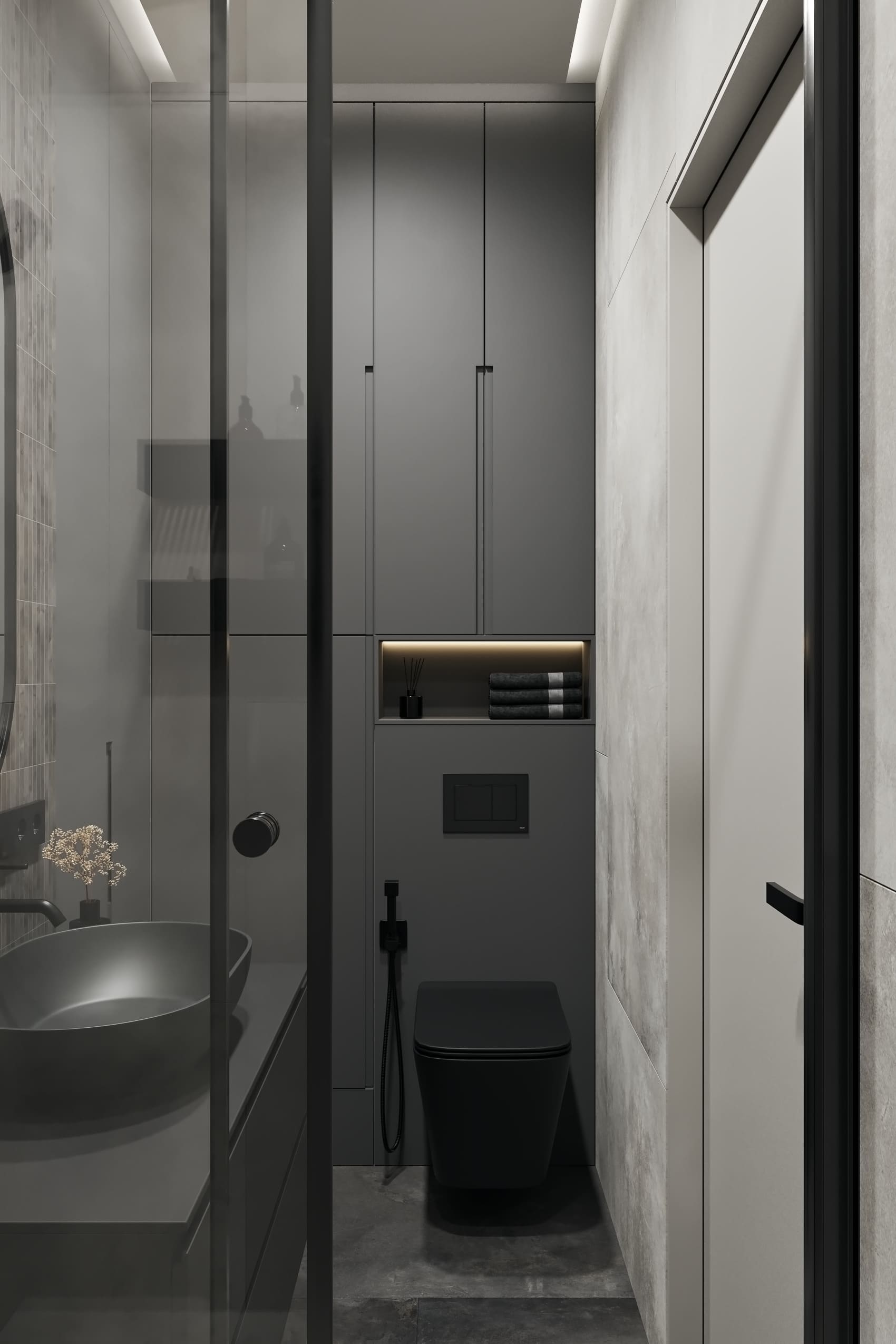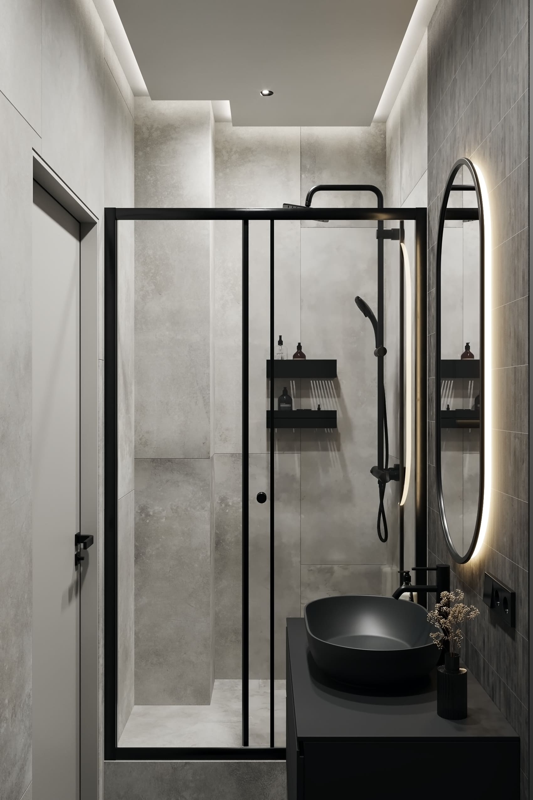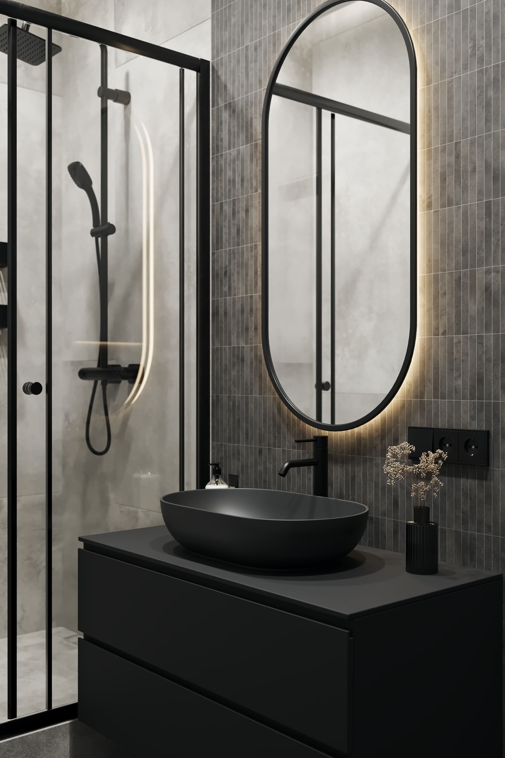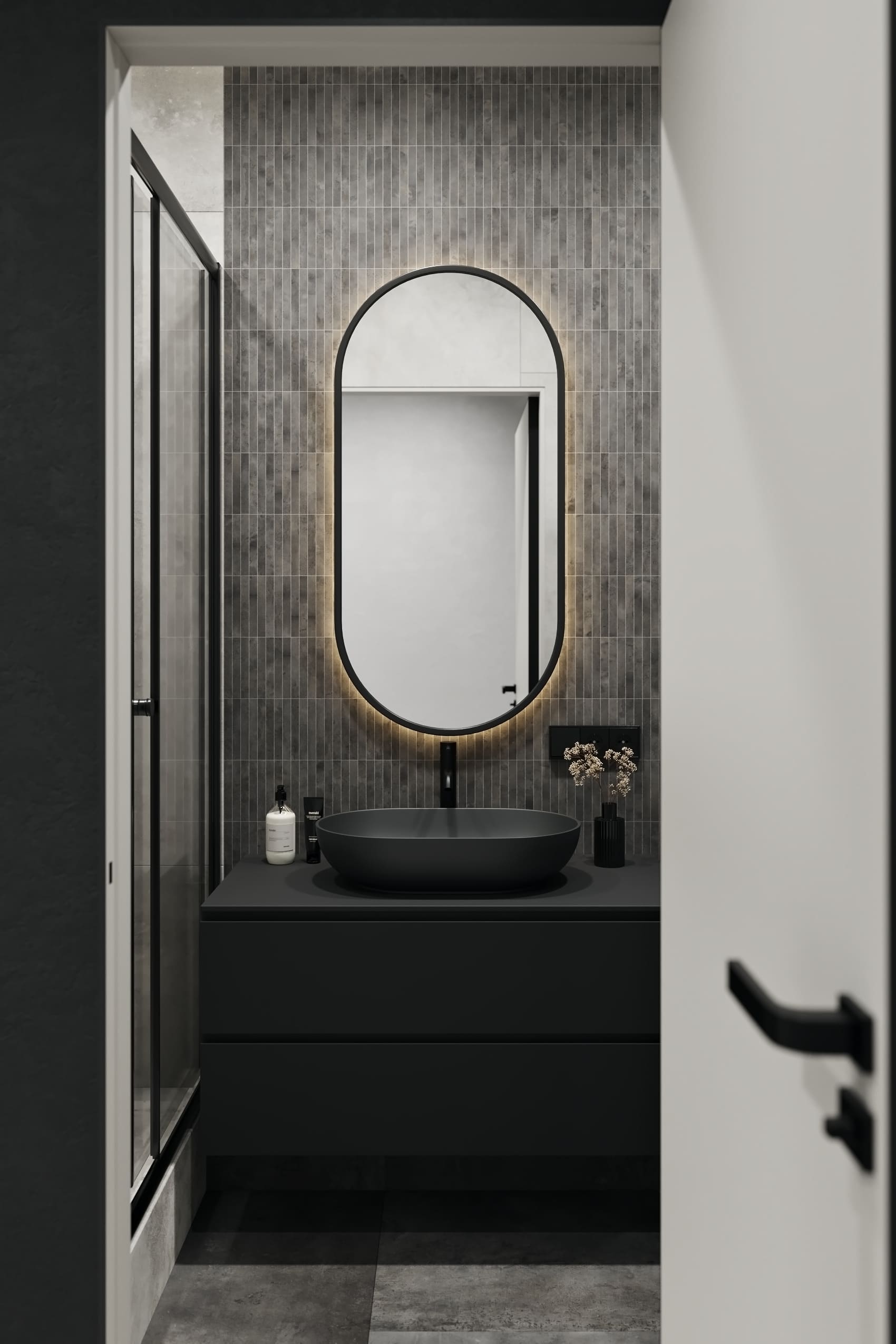 Санузел выполнен в контрастной гамме: черная душевая кабина с металлической рамой, черная раковина, овальное зеркало с подсветкой. Светлые бетонные поверхности уравновешивают темные элементы, встроенная подсветка добавляет глубину и визуальный объем.
