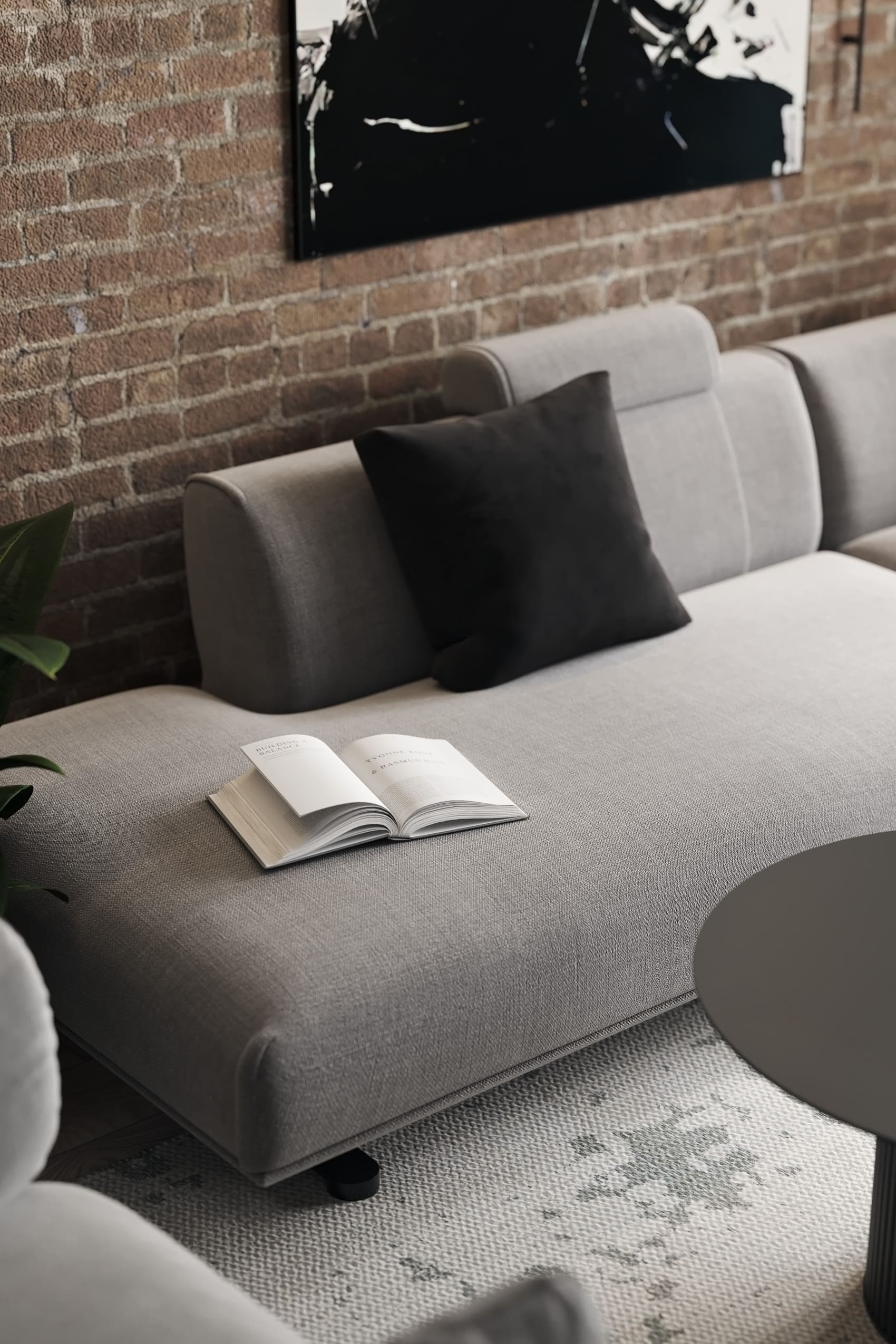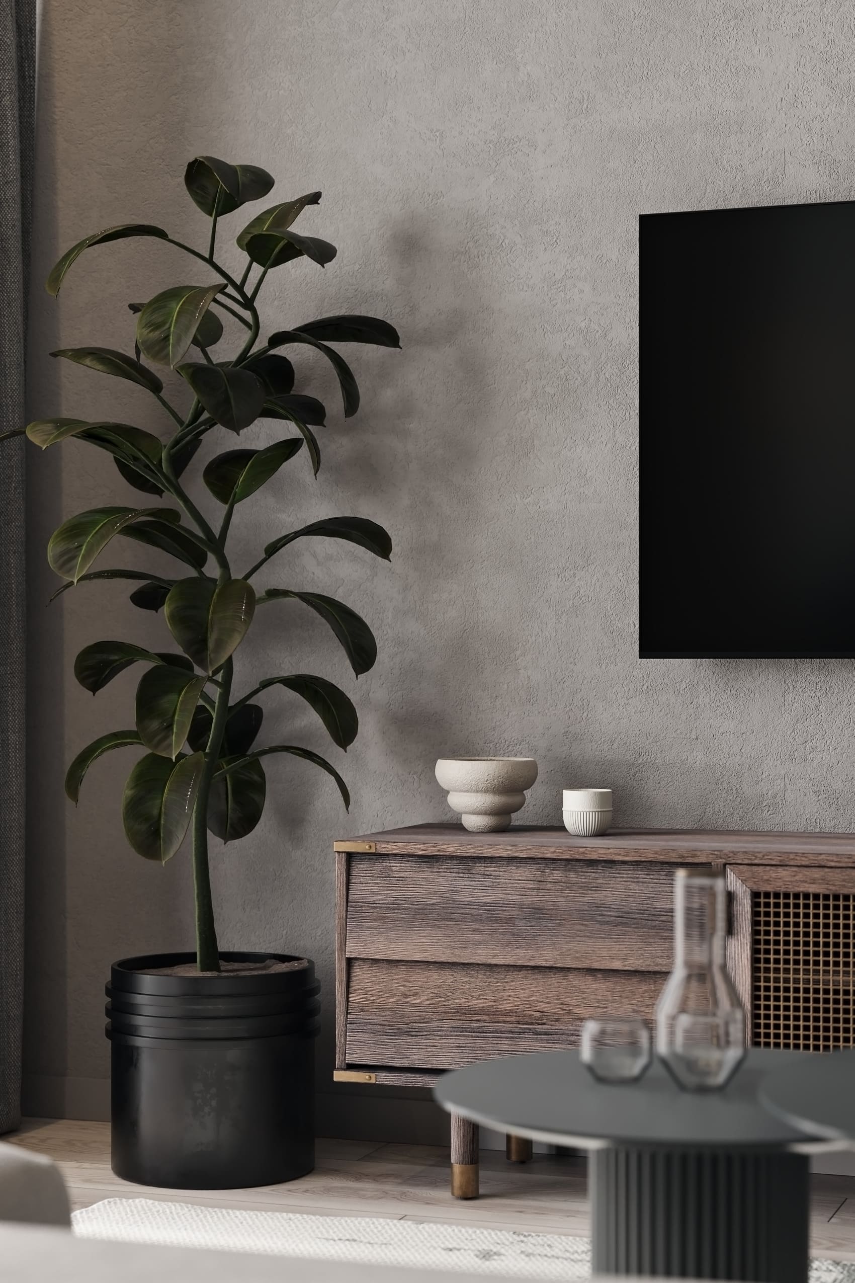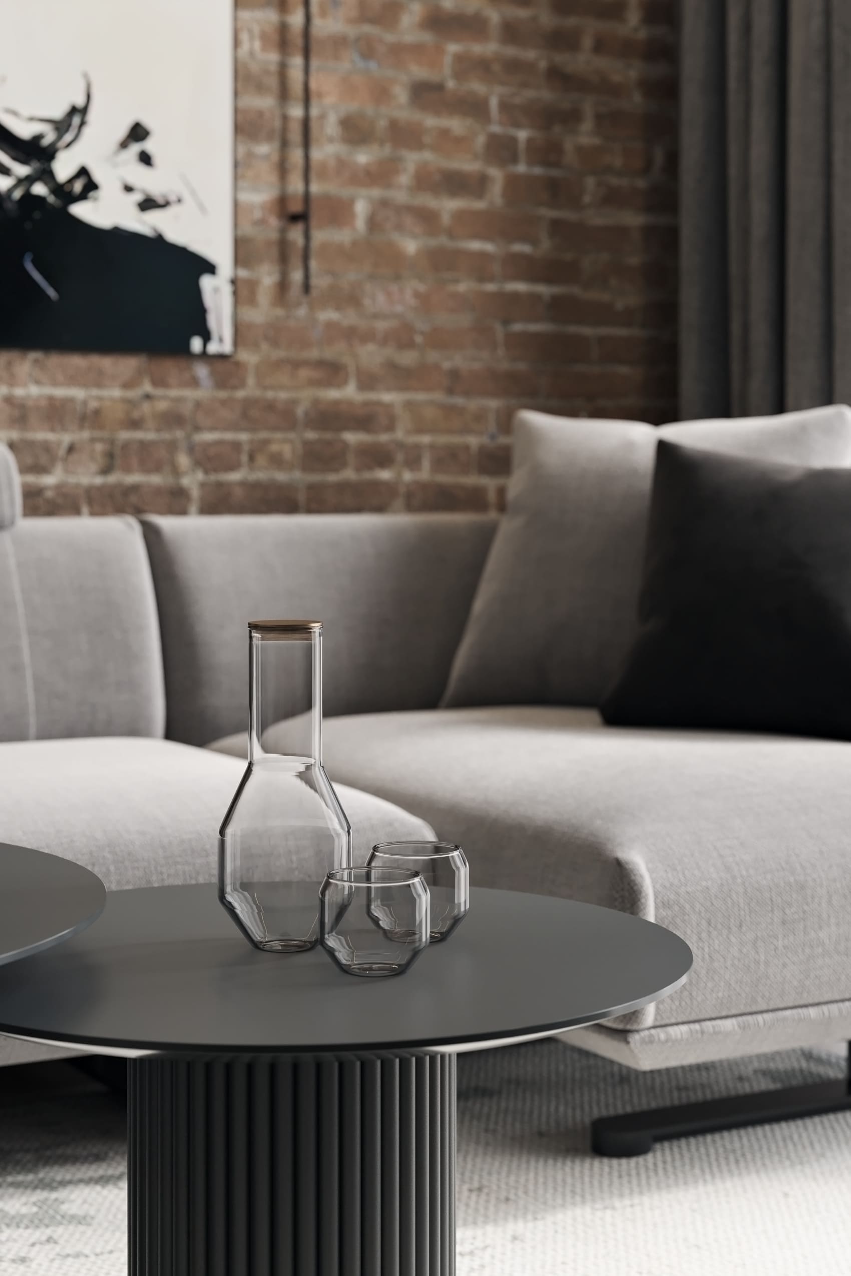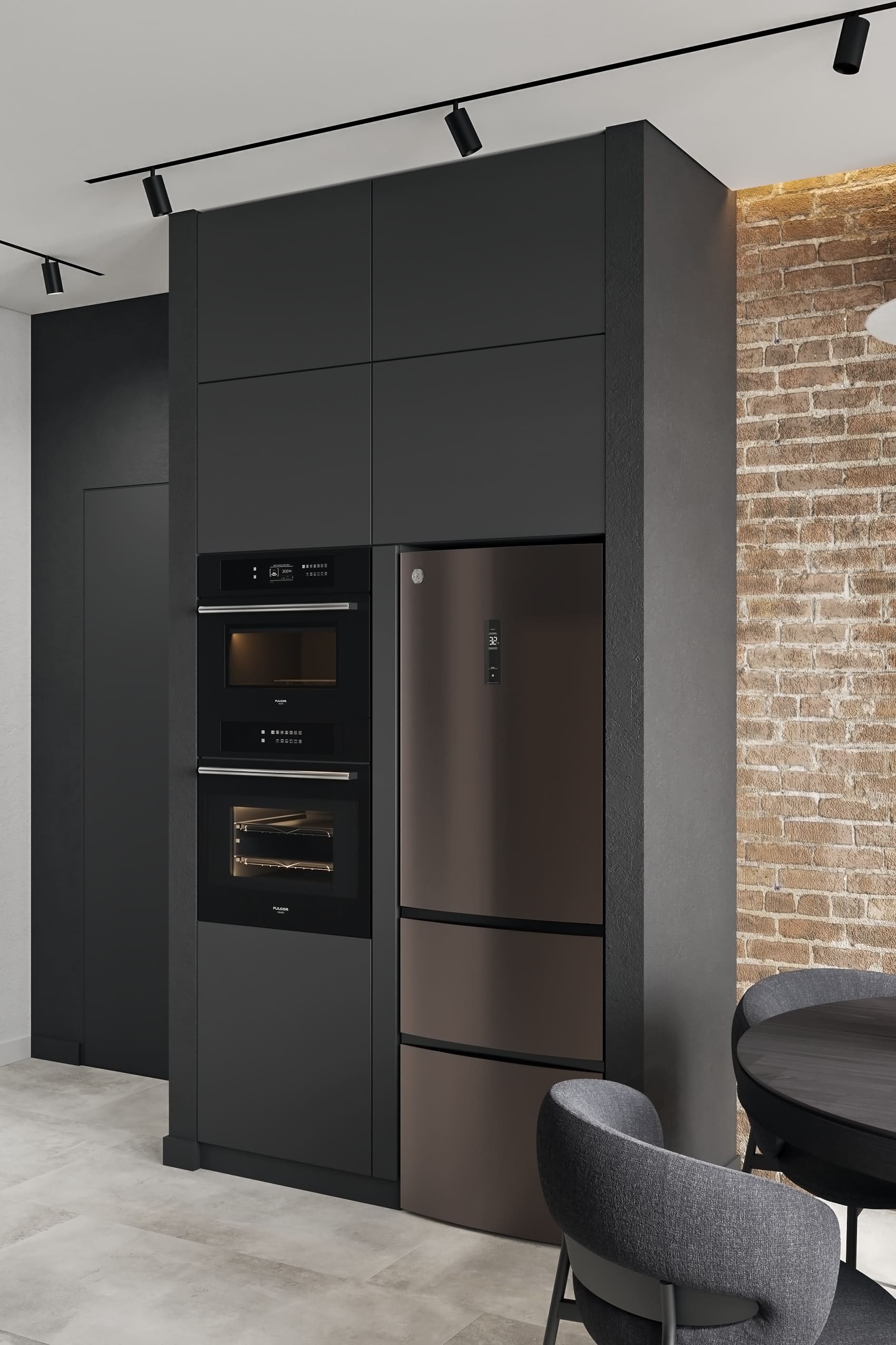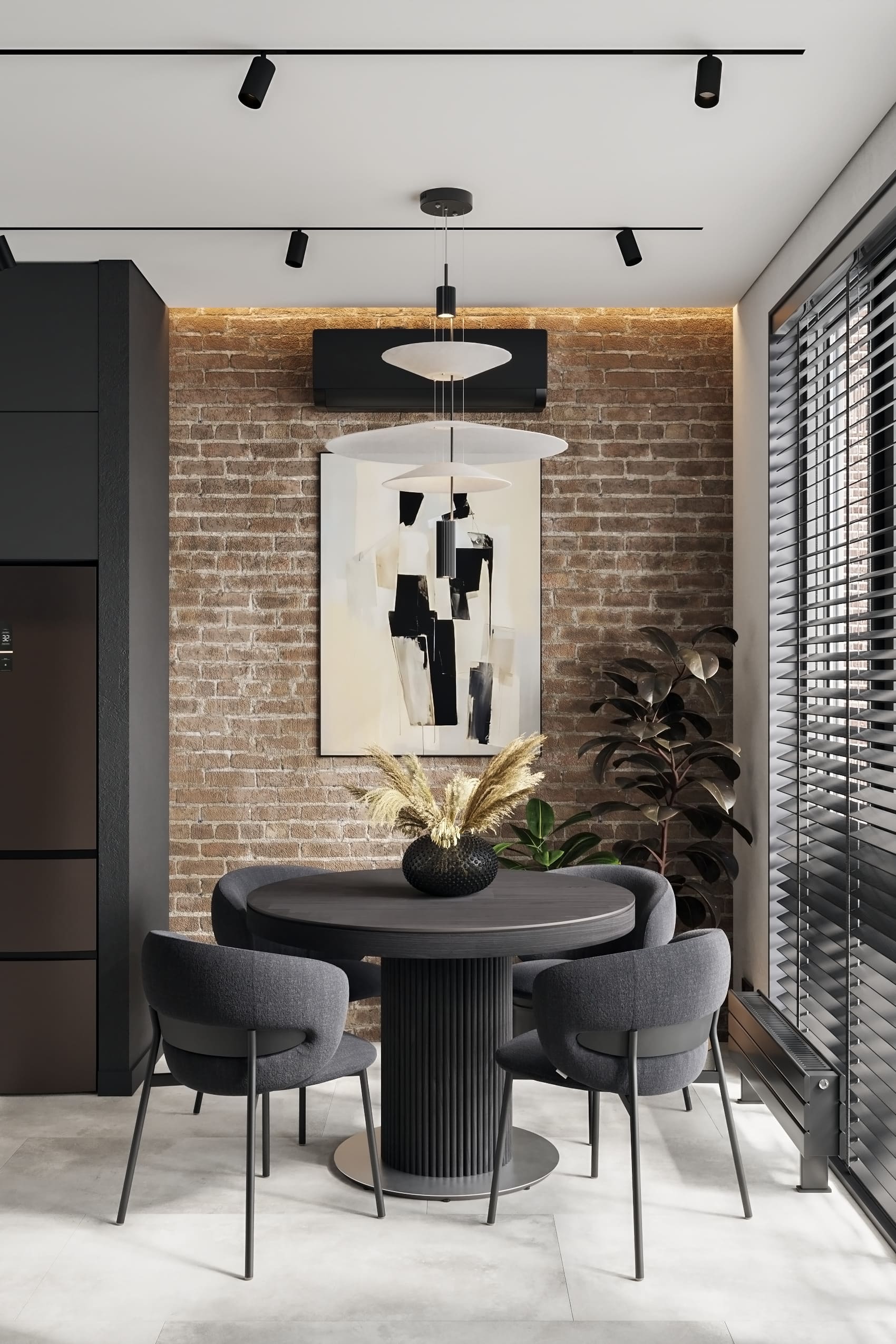 Кухонно-столовая зона оформлена в графитовой палитре с матовыми фасадами и встроенной техникой. Обеденная группа - круглый чёрный стол и эргономичные стулья - формирует компактную и удобную зону для приёма пищи. Кирпичная стена используется как фактурный акцент, подчеркивающий индустриальный характер пространства. Барная стойка служит дополнительной функциональной зоной.