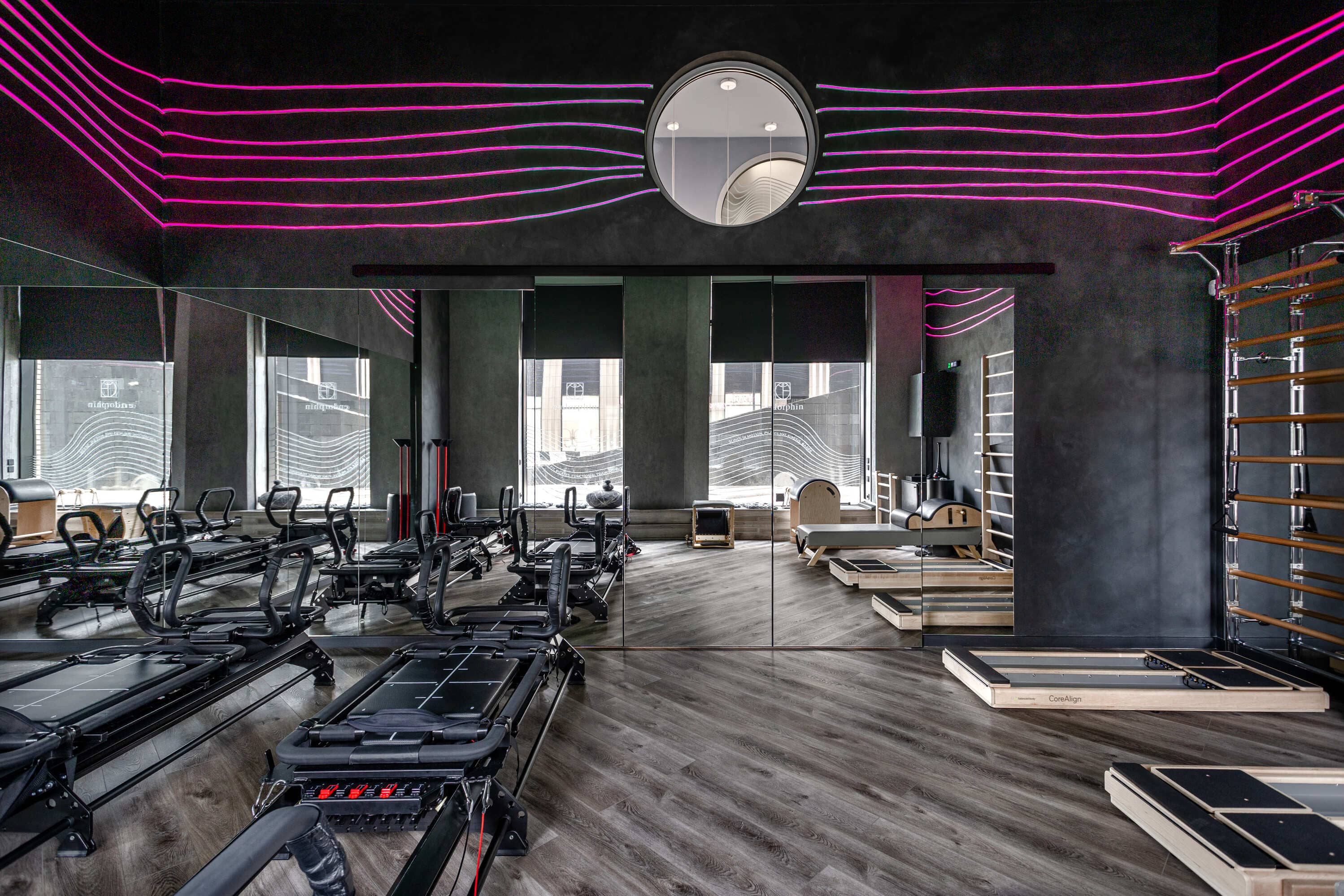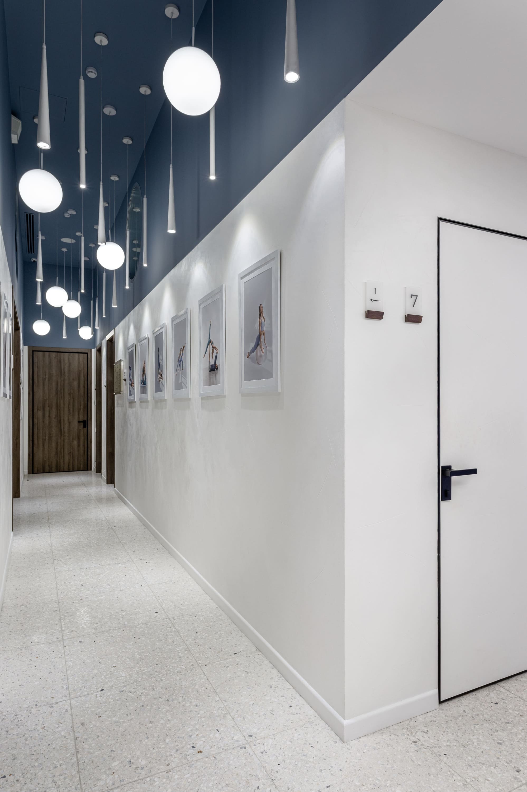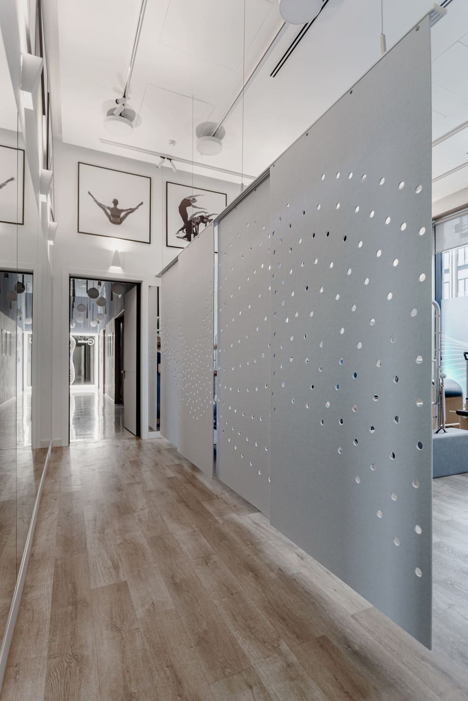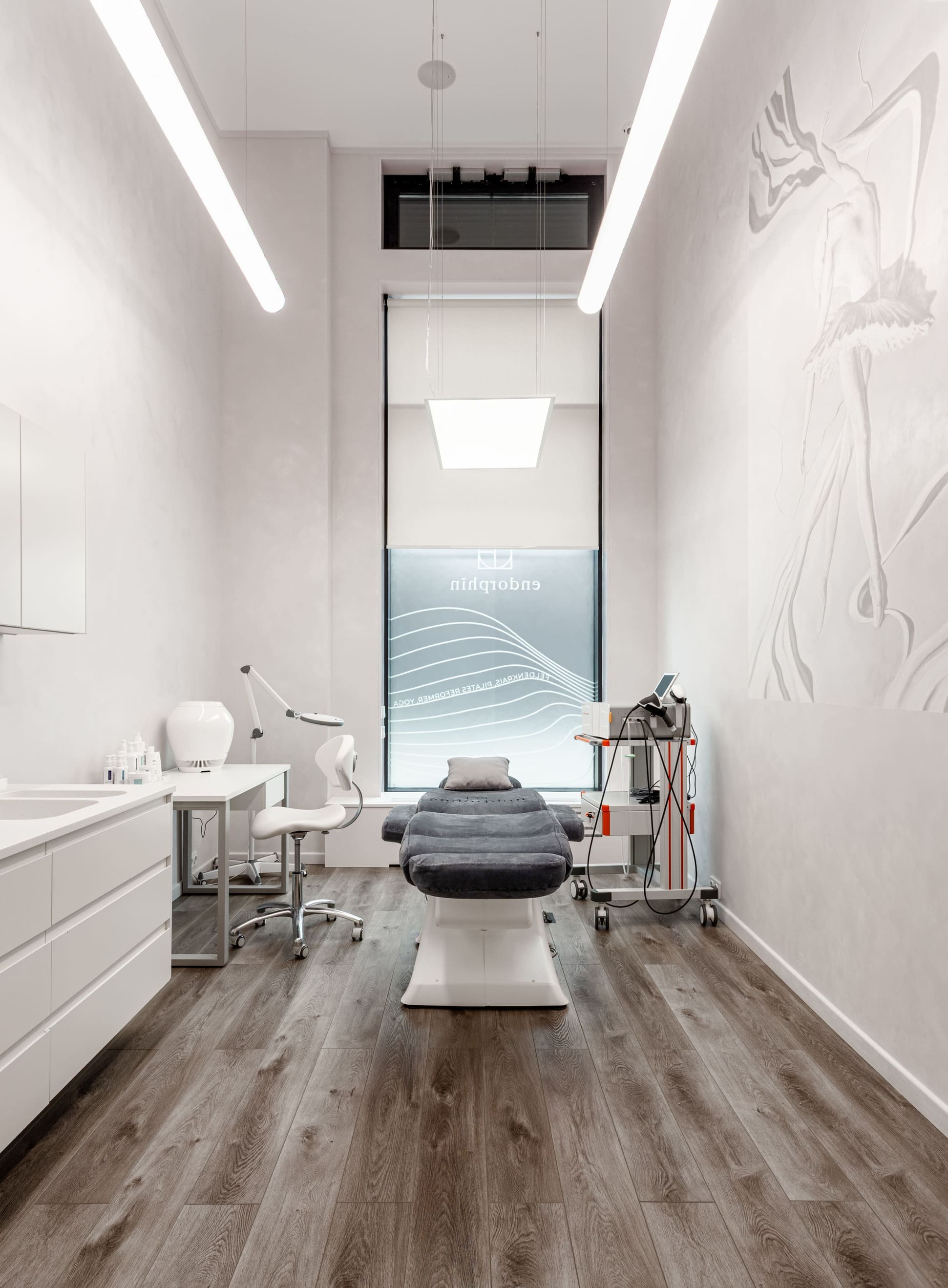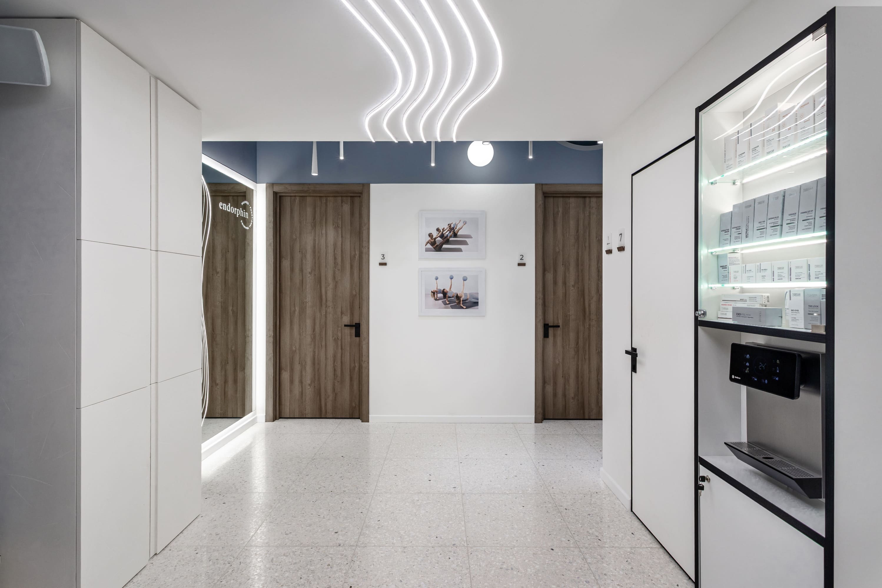 Все световые сценарии рассчитаны под разные форматы занятий и позволяют регулировать яркость и атмосферу пространства. Освещение равномерное, комфортное для глаз и подчёркивает геометрию интерьера, не отвлекая от тренировочного процесса. Проект «Эндорфин» - пример сдержанного, технически выверенного интерьера, где дизайн полностью отвечает задаче удобной и профессиональной работы студии.