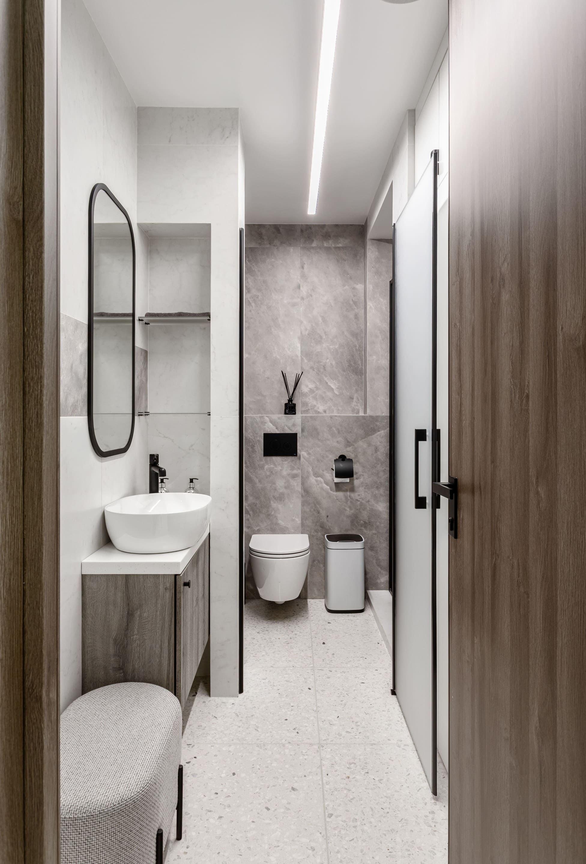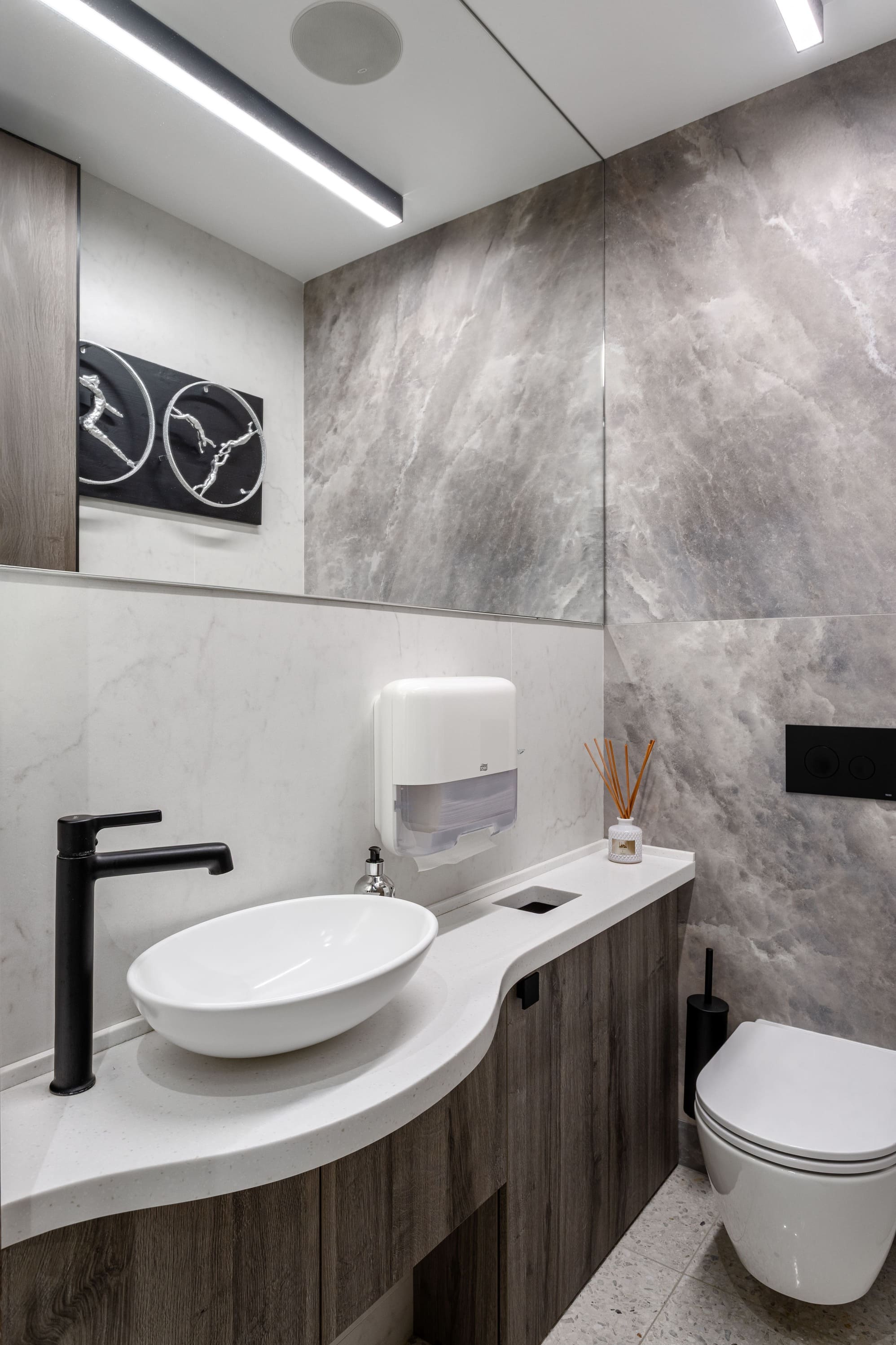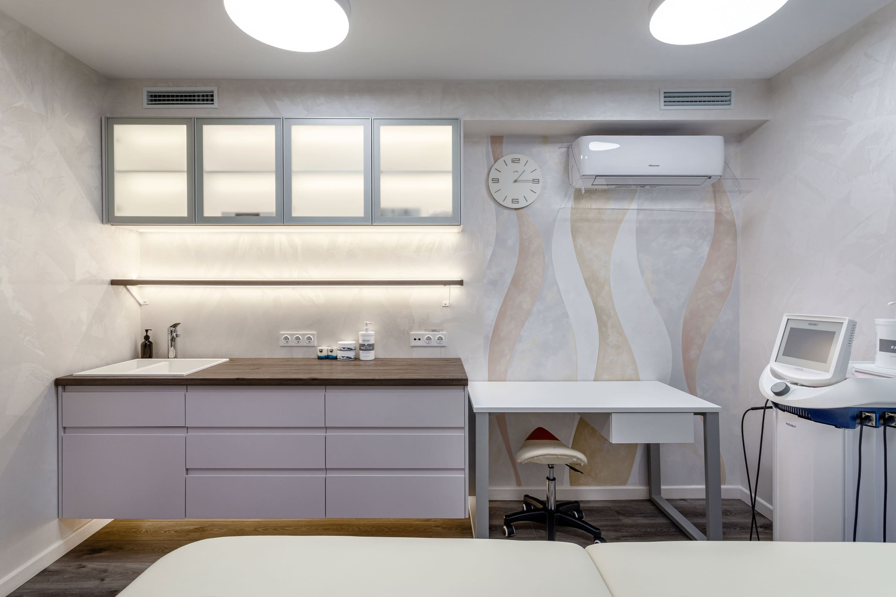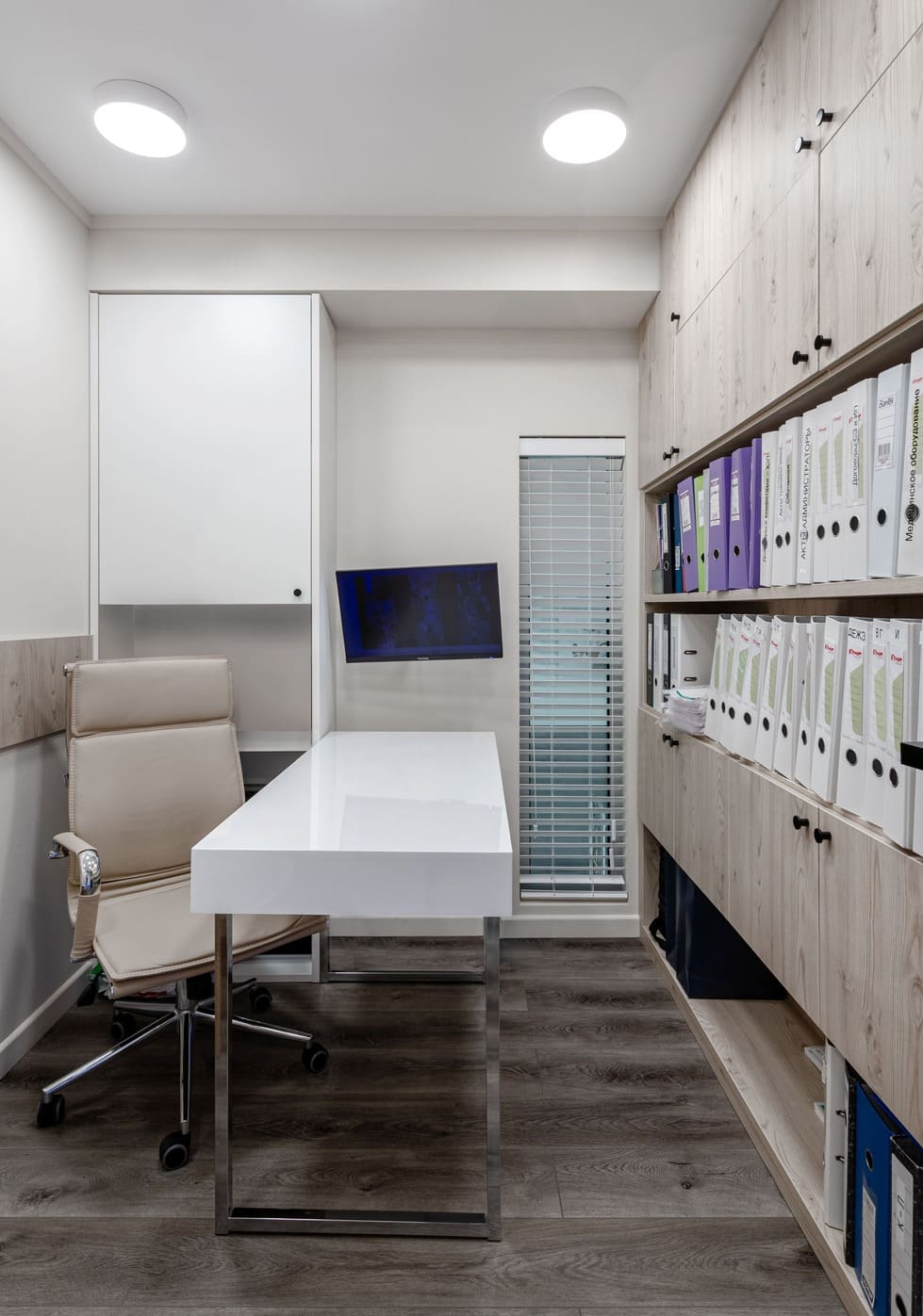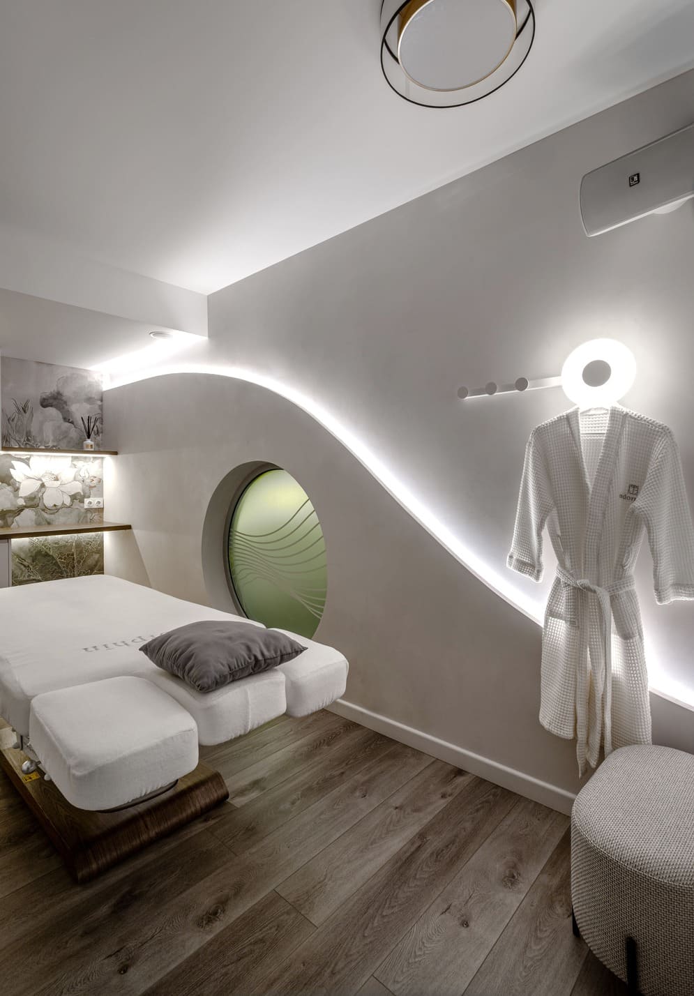 Все световые сценарии рассчитаны под разные форматы занятий и позволяют регулировать яркость и атмосферу пространства. Освещение равномерное, комфортное для глаз и подчёркивает геометрию интерьера, не отвлекая от тренировочного процесса. Проект «Эндорфин» - пример сдержанного, технически выверенного интерьера, где дизайн полностью отвечает задаче удобной и профессиональной работы студии.