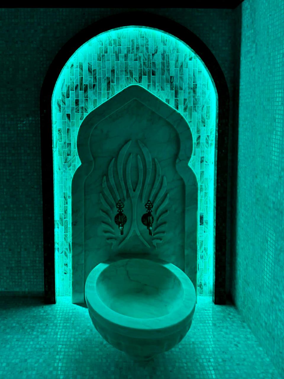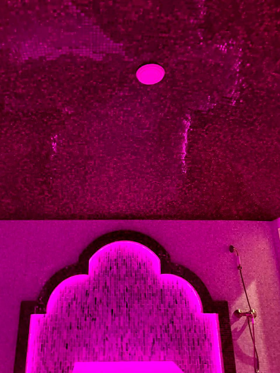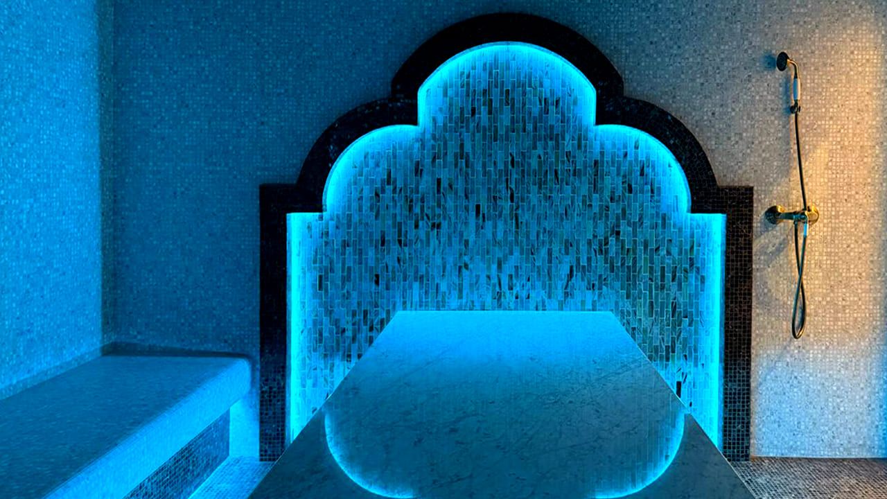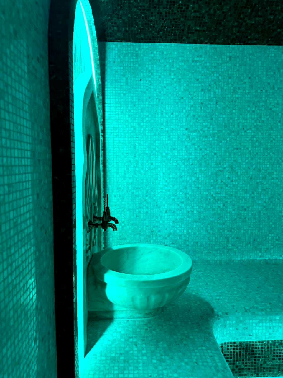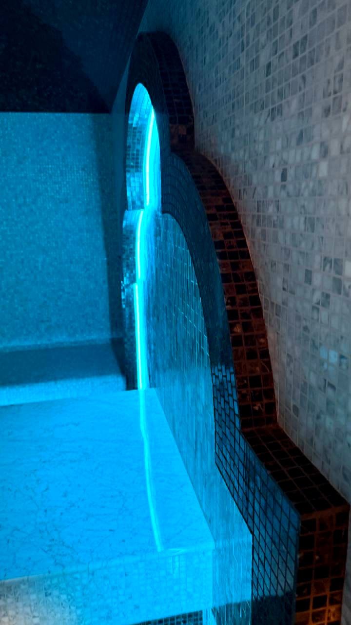 Такой свет подчеркивает архитектуру хаммама и делает ее живой. Отражения на мозаике, мерцание на куполе, игра света в паре — всё это создаёт ощущение восточного уюта и роскоши.