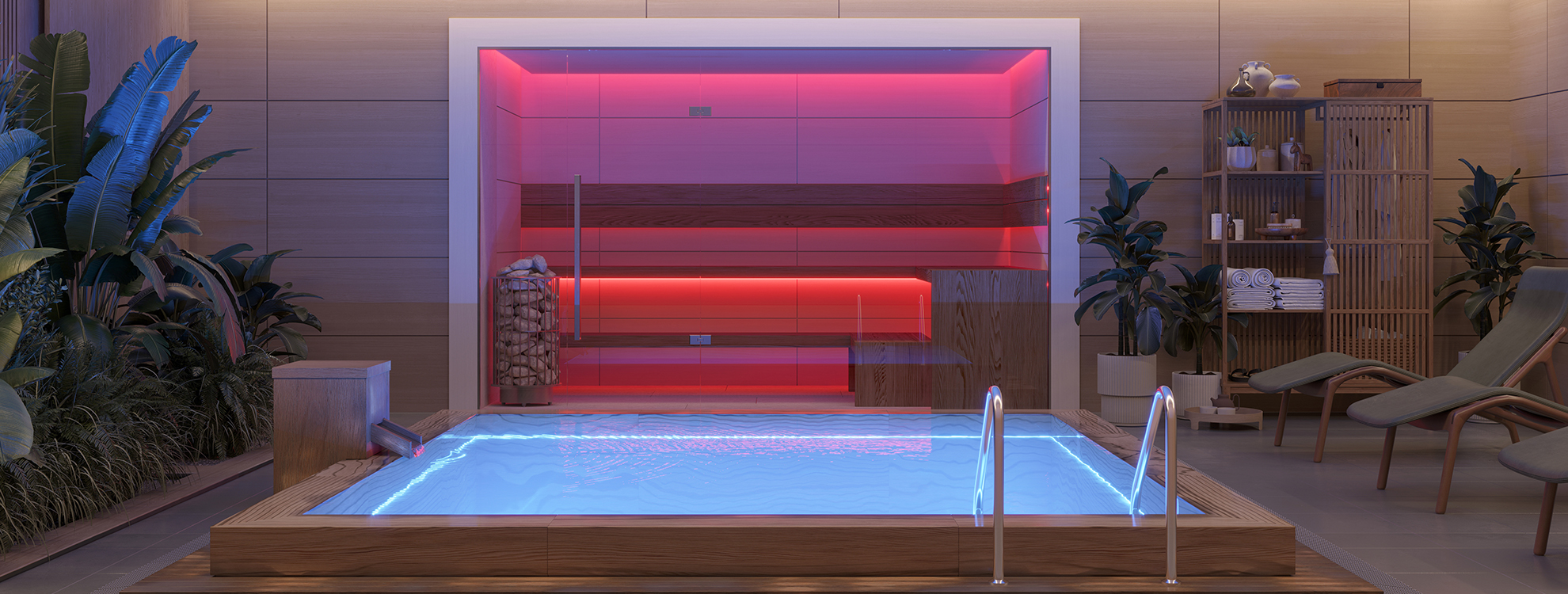 RGB-свет создаёт эффектную подсветку и открывает безграничные возможности для дизайна: от уютной подсветки в хамаме до динамичных цветовых акцентов у бассейна.